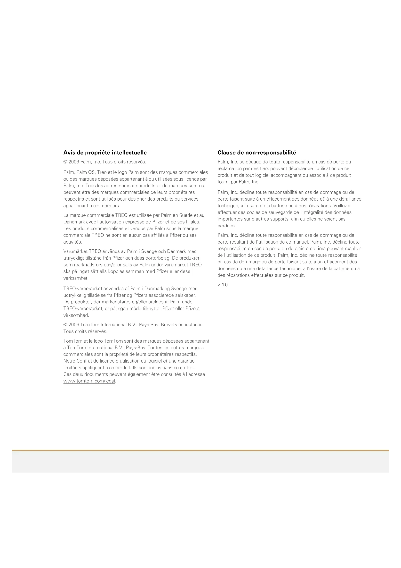 30Avis de propriété intellectuelle © 2006 Palm, Inc. Tous droits réservés. Palm, Palm OS, Treo et le logo Palm sont des marques commerciales ou des marques déposées appartenant à ou utilisées sous licence par Palm, Inc. Tous les autres noms de produits et de marques sont ou peuvent être des marques commerciales de leurs propriétaires respectifs et sont utilisés pour désigner des produits ou services appartenant à ces derniers. La marque commerciale TREO est utilisée par Palm en Suède et au Danemark avec l’autorisation expresse de Pfizer et de ses filiales. Les produits commercialisés et vendus par Palm sous la marque commerciale TREO ne sont en aucun cas affiliés à Pfizer ou ses activités. Varumärket TREO används av Palm i Sverige och Danmark med uttryckligt tillstånd från Pfizer och dess dotterbolag. De produkter som marknadsförs och/eller säljs av Palm under varumärket TREO ska på inget sätt alls kopplas samman med Pfizer eller dess verksamhet. TREO-varemærket anvendes af Palm i Danmark og Sverige med udtrykkelig tilladelse fra Pfizer og Pfizers associerede selskaber. De produkter, der markedsføres og/eller sælges af Palm under TREO-varemærket, er på ingen måde tilknyttet Pfizer eller Pfizers virksomhed. © 2006 TomTom International B.V., Pays-Bas. Brevets en instance. Tous droits réservés. TomTom et le logo TomTom sont des marques déposées appartenant à TomTom International B.V., Pays-Bas. Toutes les autres marques commerciales sont la propriété de leurs propriétaires respectifs. Notre Contrat de licence d’utilisation du logiciel et une garantie limitée s’appliquent à ce produit. Ils sont inclus dans ce coffret. Ces deux documents peuvent également être consultés à l’adresse www.tomtom.com/legal