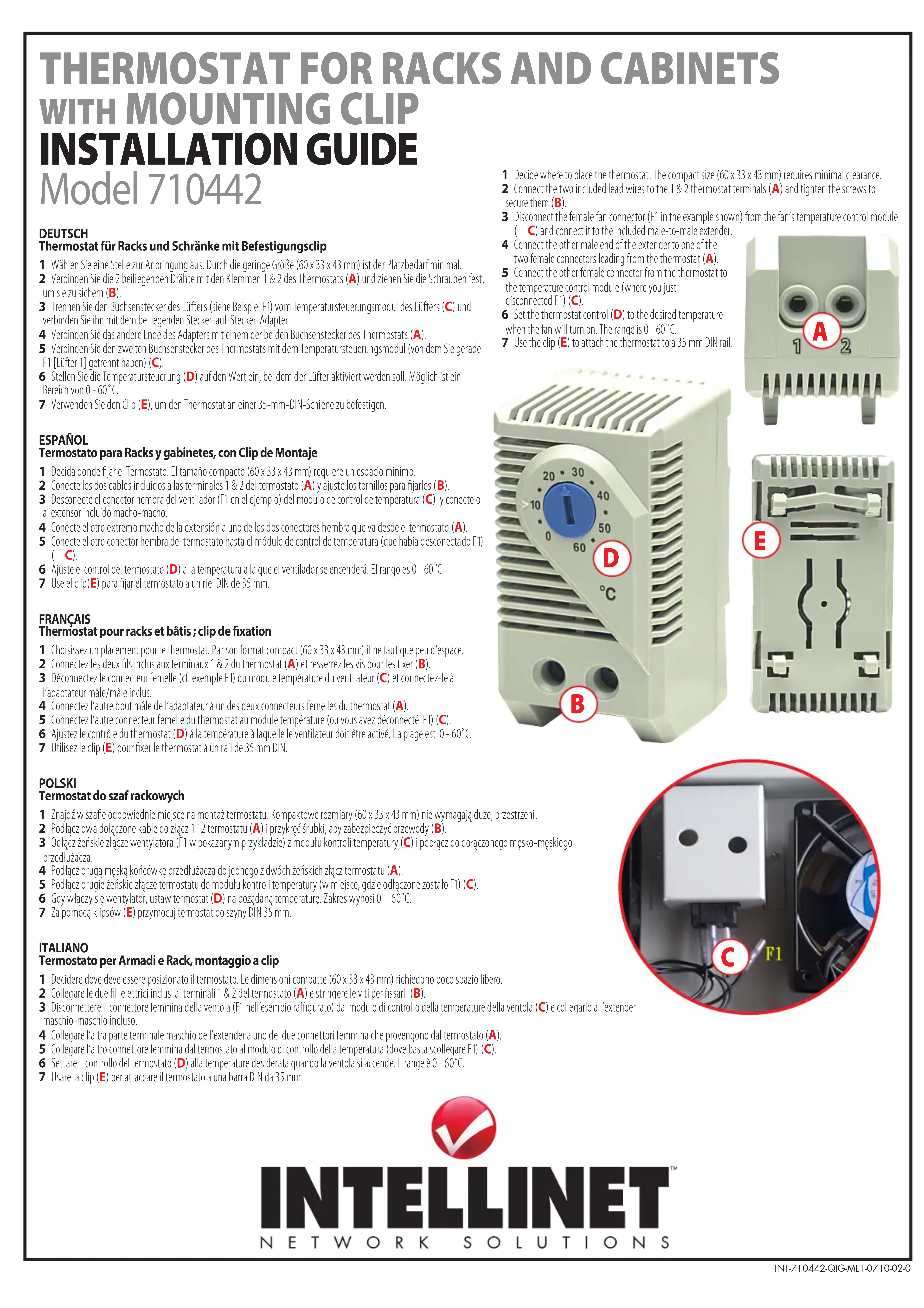1 Choisissez un placement pour le thermostat. Par son format compact (60× 33× 43mm) il ne faut que peu d'espace. 2 Connectez les deux fils inclus aux terminaux 1 & 2 du thermostat (A) et resserrez les vis pour les fixer (B). 3 Déconnectez le connecteur femelle (cf. exemple F1) du module température du ventilateur (C) et connectez-le à l'adaptateur masculin/male inclus. 4 Connectez l'autre bout male de l'adaptateur à un des deux connecteurs femelles du thermostat (A). 5 Connectez l'autre connecteur femelle du thermostat au module température (ou vous avez déconnecté F1) (C). 6 Ajustez le contrôle du thermostat (D) à la température à laquelle le ventilateur doit être activé. La plage est 0 - 60°C. 7 Utilisez le clip (E) pour fixer le thermostat à un rail de 35 mm DIN.