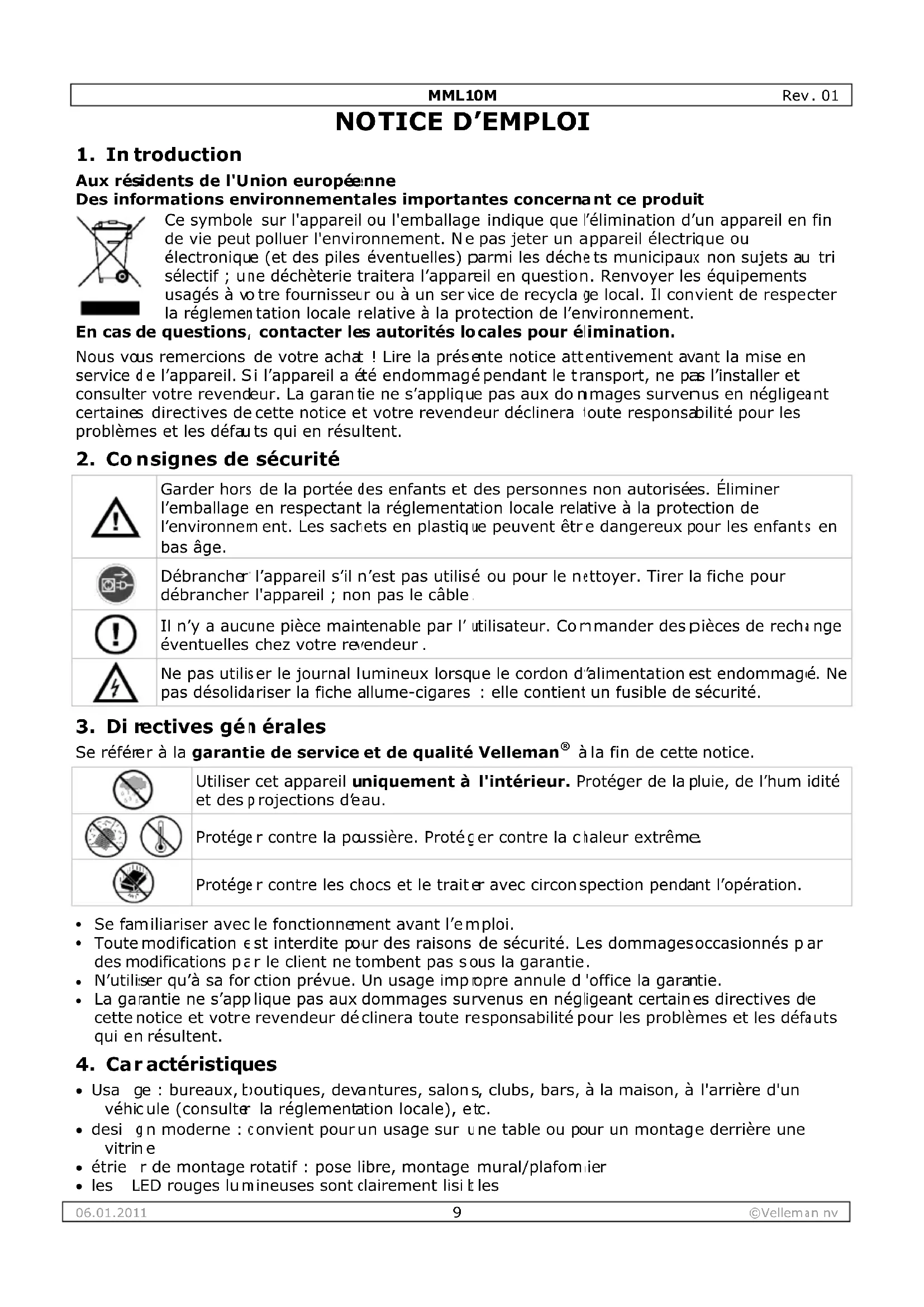 Retrouvez gratuitement la notice de l'appareil MML10M VELLEMAN au format PDF.