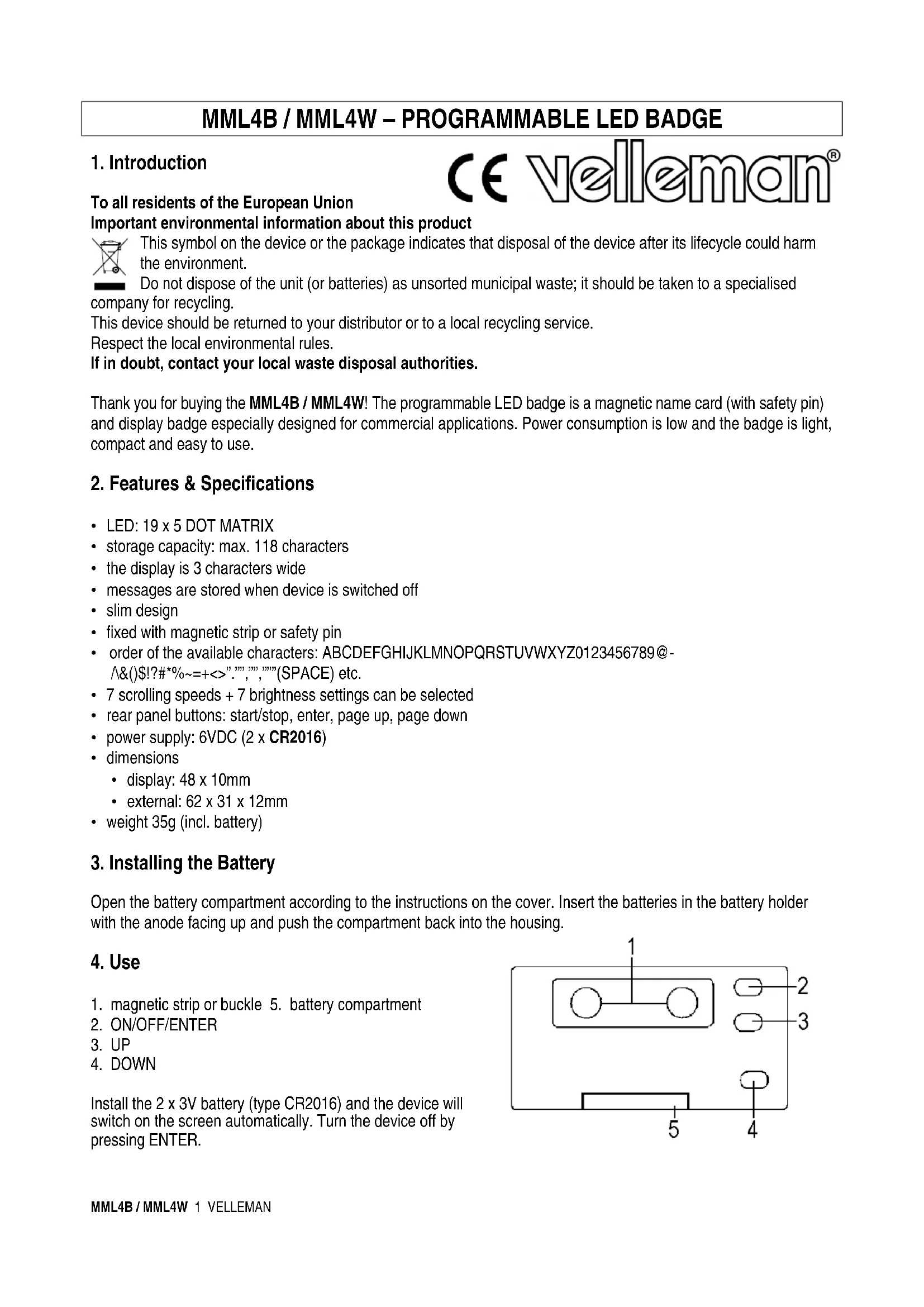 MML4W - Badge électronique programmable VELLEMAN - Notice d'utilisation et mode d'emploi gratuit