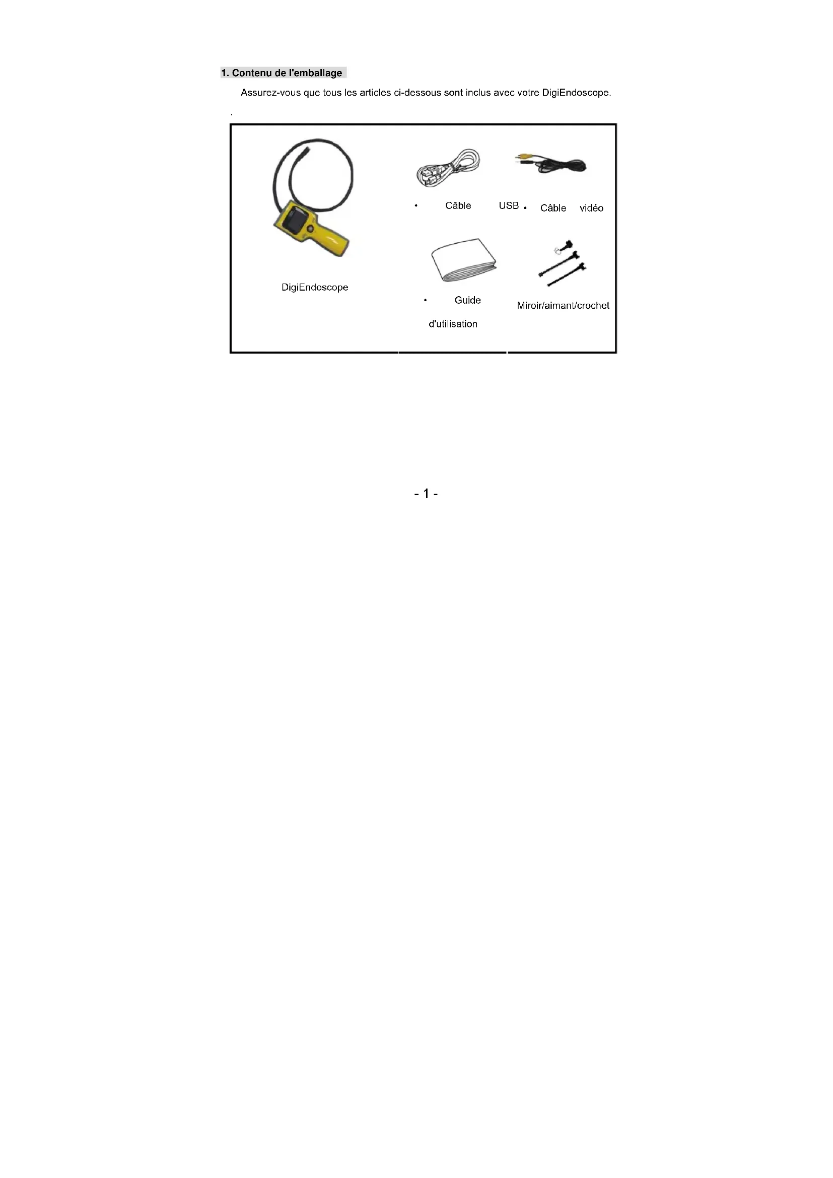 Assurez-vous que tous les articles ci-dessous sont inclus avec votre DigiEndoscope.