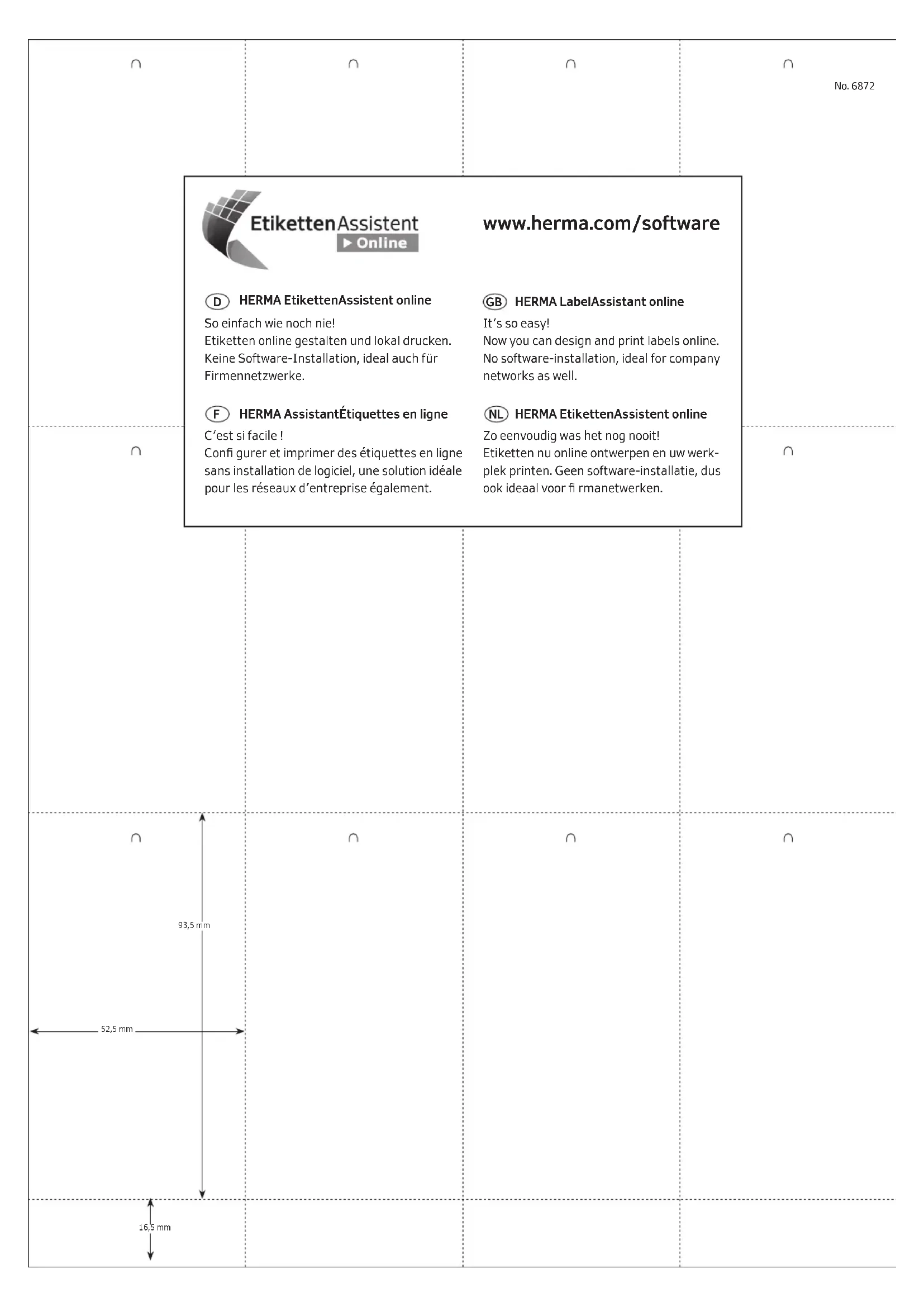 | EtikettenAssistant Online HERMA EtikettenAssistant online So einfach wie noch nicht! Etiketten online gestalten und lokal drucken. Keine Software-Installation, ideal auch für Firmennetzwerke. F HERMA Assistant Étiquettes en ligne C'est si facile! Confi gurer et imprimer des étiquettes en ligne sans installation de logiciel, une solution idéale pour les réseaux d'entreprise également. | www/herma.com/software GB HERMA LabelAssistant online It's so easy! Now you can design and print labels online. No software-installation, ideal for company networks as well. NL HERMA EtikettenAssistant online Zo eenvoudig was het nog nooit! Etiketten nu online ontwerpen en uw werkplek printen. Geen software-installatie, dus ookideal voor fi rmanetwerken. |