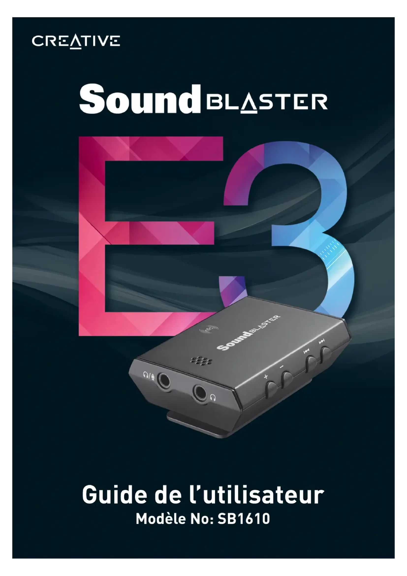 operation. CAUTION: To comply with the limits of the Class B digital device, pursuant to Part 15 of the FCC Rules, this device must be installed with computer equipment certified to comply with Class B limits. All cables used to connect to the computer and peripherals must be shielded and grounded. Operation with non-certified computers or non-shielded cables may result in interference to radio or television reception. MODIFICATION: Any changes or modifications not expressly approved by the grantee of this device could void the user's authority to operate the device. Sound Blaster E3 – Informations réglementaires 40Avis pour le Canada This Class B digital apparatus complies with Canadian ICES-003. Cet appareil numérique de la classe B est conforme à la norme NMB-003 du Canada. CANADIANCLASSBSTATEMENT: This digital device does not exceed the Class B limits for radio noise emissions from digital apparatus as set out in the interference-causing equipment statement entitled "Digital Apparatus", ICES-003 of the Department of Communications. Cet appareil numerique respecte les limites de bruits radioelectriques applicables aux appareils numeriques de Class B prescrites dans la norme sur le materiel brouilleur. “Appareils Numeriques,” NMB-003 edictee par le ministre des Communications. MODIFICATION: Any changes or modifications not expressly approved by the grantee of this device could void the user's authority to operate the device. Toute modification non approuvé explicitement par le fournisseur de licence de l’appareil peut entraîner l’annulation du droit de l’utilisateur à utiliser l’appareil. Sound Blaster E3 – Informations réglementaires 41DECLARATION OF CONFORMITY According to the FCC96 208 and ET95-19 Manufacturer/Importer’s Name: Creative Labs, Inc. Manufacturer/Importer’s Address: 1901 McCarthy Boulevard Milpitas, CA. 95035 Tel: (408) 428-6600 declares under its sole responsibility that the product Trade Name: Creative Model Numbers: SB1610 has been tested according to the FCC / CISPR22 requirement for Class B devices and found compliant with the following standards: EMI/EMC: ANSI C63.4, FCC Part 15 Subpart B& C Complies with Canadian ICES-003 Class B, RSS-GEN & RSS-210 This device complies with part 15 of the FCC Rules. Operation is subject to the following two conditions: (1) This device may not cause harmful interference, and (2) this device must accept any interference received, including Interference that may cause undesirable operation. Ce matériel est conforme à la section 15 des régles FCC. Son Fonctionnement est soumis aux deux conditions suivantes : (1) Le matériel ne peut étre source D’interférences et (2) Doit accepter toutes les interférences reques, Y compris celles pouvant provoquer un fonctionnement indésirable. Supplementary Information: Compliance Manager Creative Labs, Inc. June 10, 2014 Sound Blaster E3 – Informations réglementaires 42Conformité européenne Ce produit est conforme aux normes suivantes : Directive 2004/108/CE sur les émissions électromagnétiques. Directive RoHS 2011/65/UE. Les produits secteur pour le marché européen sont conformes à la Directive sur la faible tension 2006/95/CE et à la réglementation de la Commission exécutant la Directive 2009/125/CE. Les produits de communication/sans fil RF destinés au marché européen sont conformes à la directive R&TTE 1999/5/CE. ATTENTION : pour respecter les critères CE d'Europe, cet appareil doit être installé avec du matériel informatique certifié CE respectant les limites de la classe B. Tous les câbles utilisés pour connecter cet appareil doivent être blindés, reliés à la terre et ne pas faire plus de 3 m de long. L'utilisation d'ordinateurs non certifiés ou de câbles inappropriés peut entraîner des interférences avec d'autres appareils ou des effets indésirables sur le produit. MODIFICATION : toute modification non approuvée explicitement par Creative Technology Limited ou l'une de ses sociétés affiliées peut entraîner l'annulation de la garantie et des droits de garantie de l'utilisateur. Sound Blaster E3 – Informations réglementaires 43Licence et Copyright Les informations contenues dans ce document sont susceptibles d'être modifiées sans préavis et n'engagent en rien la société Creative Technology Ltd. Aucune partie de ce manuel ne peut être reproduite ou transmise sous quelque forme ou par quelque moyen que ce soit, électronique ou mécanique, y compris la photocopie et l'enregistrement, à quelque fin que ce soit sans l'accord écrit de Creative Technology Ltd. © 2014 Creative Technology Ltd. Tous droits réservés. Creative, le logo Creative, Sound Blaster, le logo Sound Blaster, SBX Pro Studio, le logo SBX, et CrystalVoice sont des marques ou des marques déposées de Creative Technology Ltd. aux États-Unis et/ou dans les autres pays. La marque et les logos Bluetooth