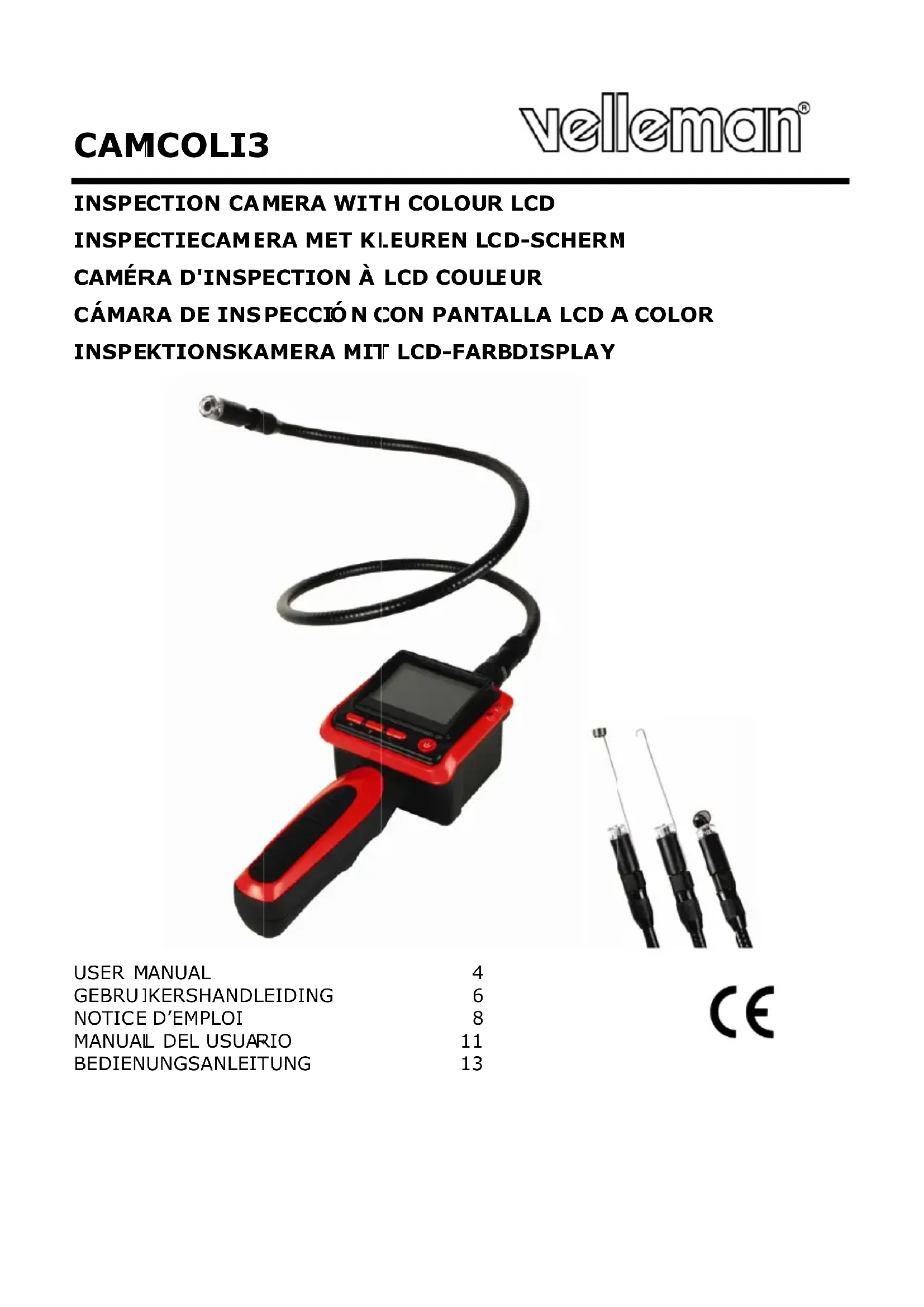 Téléchargez la notice de votre Caméra d'inspection au format PDF gratuitement ! Retrouvez votre notice CAMCOLI3N - VELLEMAN et reprennez votre appareil électronique en main. Sur cette page sont publiés tous les documents nécessaires à l'utilisation de votre appareil CAMCOLI3N de la marque VELLEMAN.