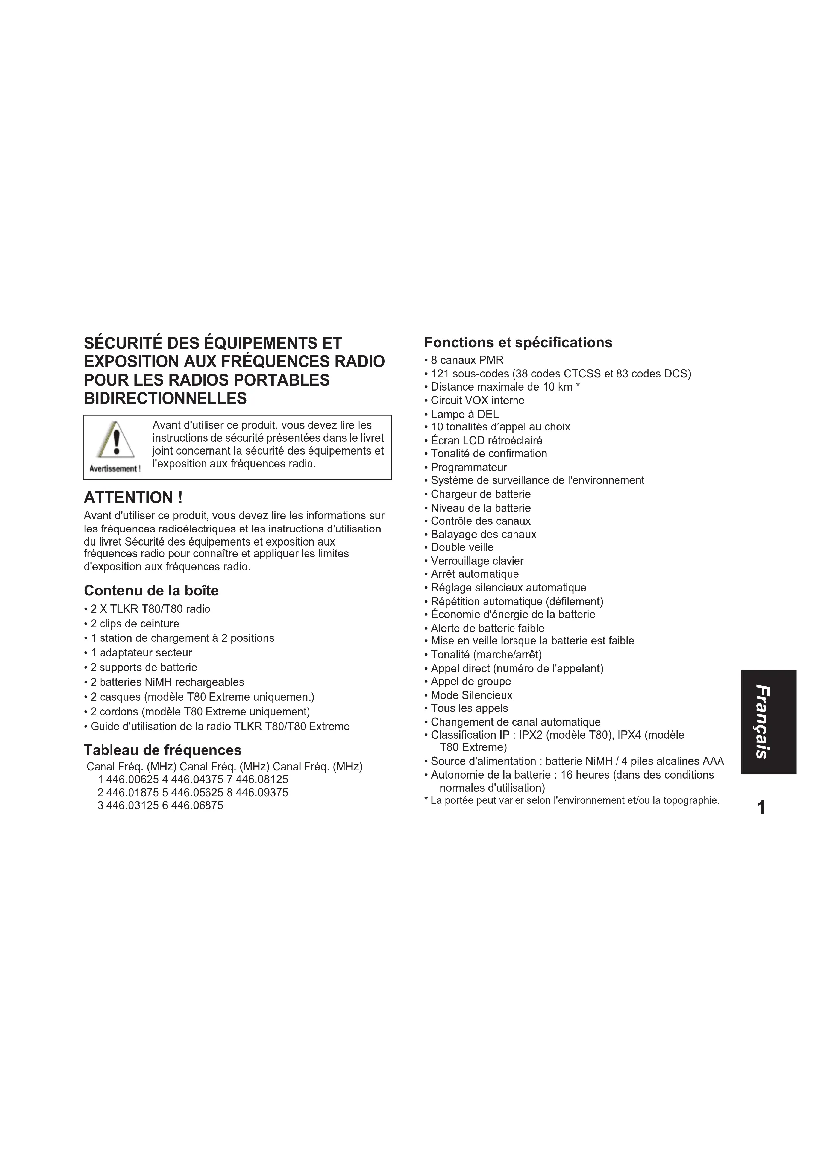 - Guide d'utilisation de la radio TLKR T80/T80 Extreme Tableau de fréquences Fonctions et spécifications