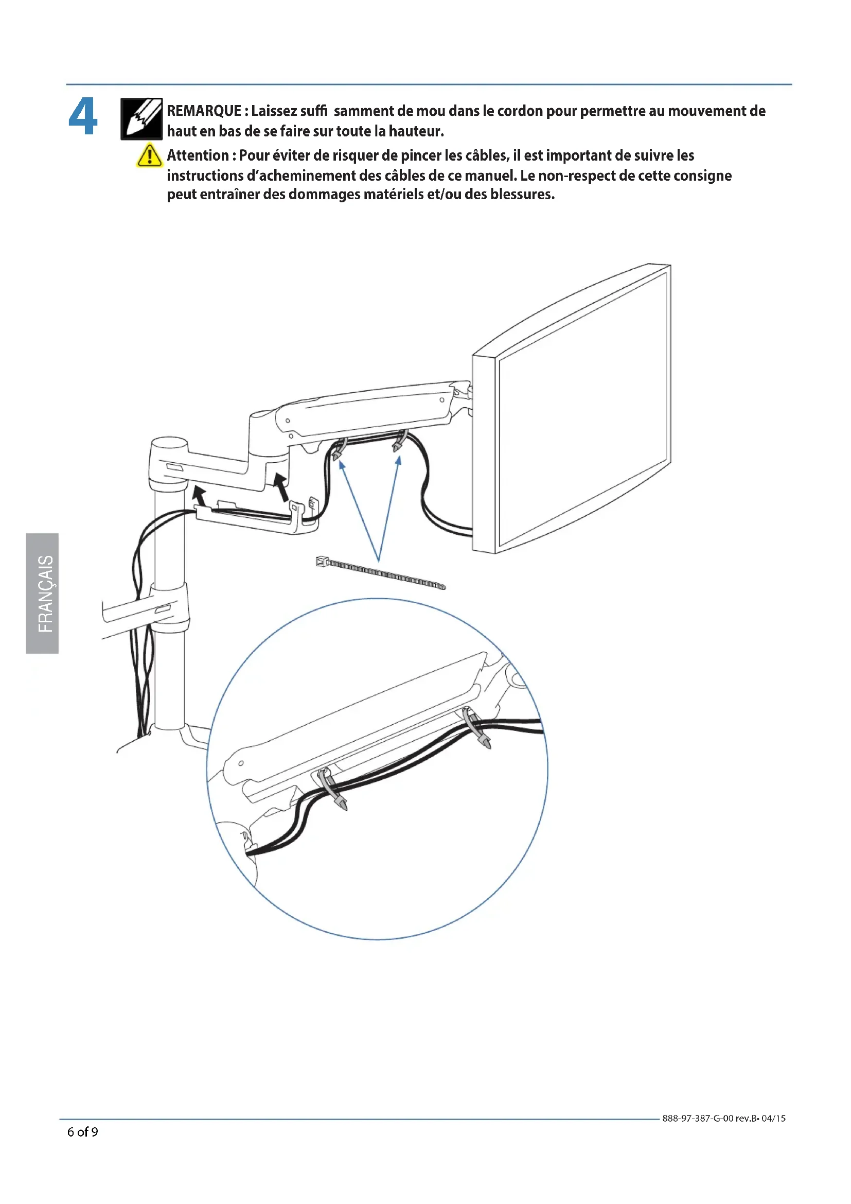 Attention: Pour éviter de risquer de pincer les câbles, il est important de suivre les instructions d'acheminement des câbles de ce manuel. Le non-respect de cette consigne peut entrainer des dommages matériels et/ou des blessures.