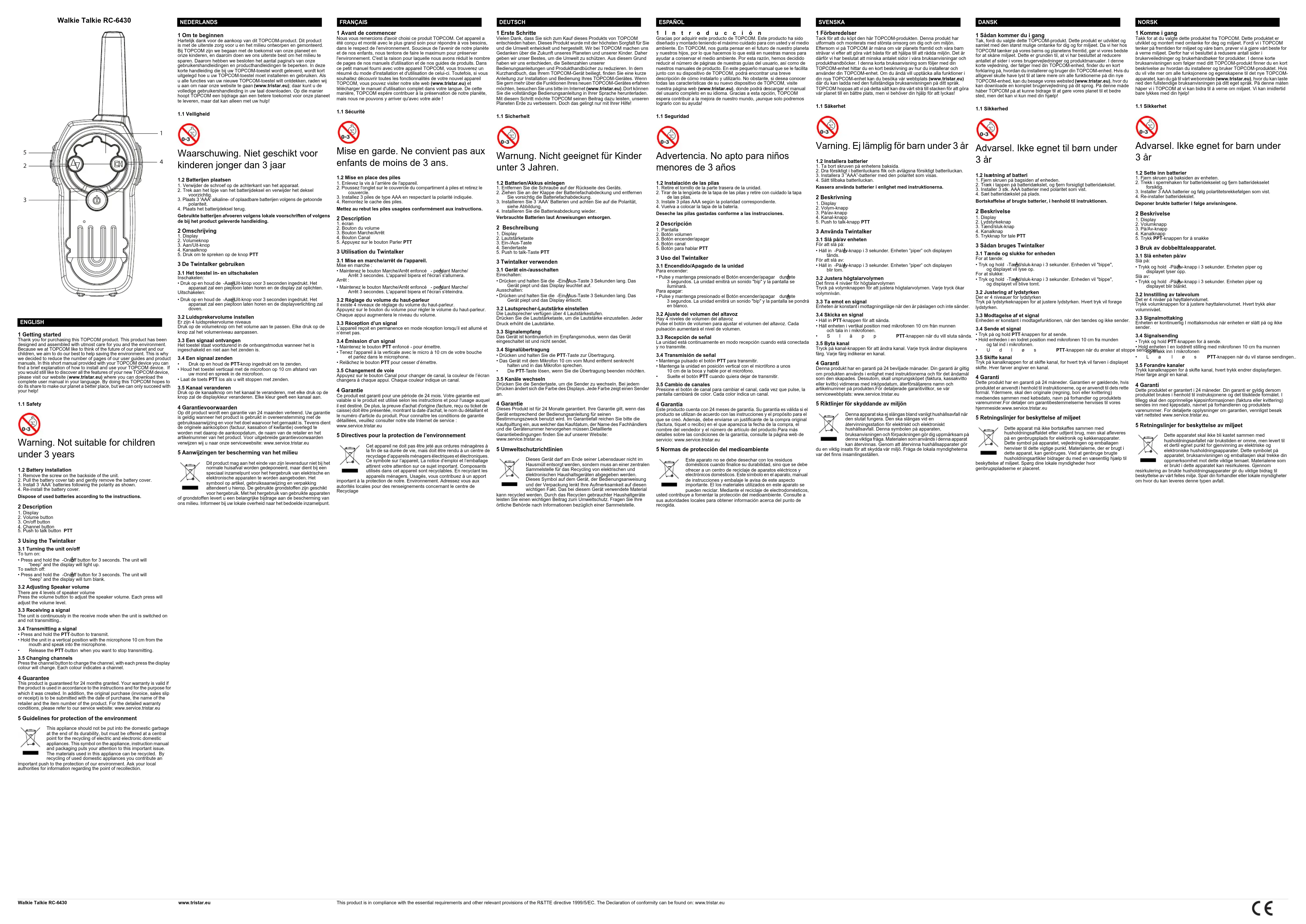 - Houd het toestel verticaal met de microfoon op 10 cm afstand van uw mond en spreek in de microfoon.• Laat de toets PTT los als u wilt stoppen met zenden.3.5 Kanaal veranderenDruk op de kanaalknop om het kanaal te veranderen, met elke druk op de knop zal de displaykleur veranderen. Elke kleur geeft een kanaal aan. 4 Garantievoorwaarden Op dit product wordt een garantie van 24 maanden verleend. Uw garantie is geldig wanneer het product is gebruikt in overeenstemming met de gebruiksaanwijzing en voor het doel waarvoor het gemaakt is. Tevens dient de originele aankoopbon (factuur, kassabon of kwitantie) overlegd te worden met daarop de aankoopdatum, de naam van de retailer en het artikelnummer van het product. Voor uitgebreide garantievoorwaarden verwijzen wij u naar onze servicewebsite: www.service.tristar.eu 5 Aanwijzingen ter bescherming van het milieu Dit product mag aan het einde van zijn levensduur niet bij het normale huisafval worden gedeponeerd, maar dient bij een speciaal inzamelpunt voor het hergebruik van elektrische en elektronische apparaten te worden aangeboden. Het symbool op artikel, gebruiksaanwijzing en verpakking attendeert u hierop. De gebruikte grondstoffen zijn geschikt voor hergebruik. Met het hergebruik van gebruikte apparaten of grondstoffen levert u een belangrijke bijdrage aan de bescherming van ons milieu. Informeer bij uw lokale overheid naar het bedoelde inzamelpunt. 1 Avant de commencer Nous vous remercions d'avoir choisi ce produit TOPCOM. Cet appareil a été conçu et monté avec le plus grand soin pour répondre à vos besoins, dans le respect de l'environnement. Soucieux de l'avenir de notre planète et de nos enfants, nous tentons de faire le maximum pour préserver l'environnement. C'est la raison pour laquelle nous avons réduit le nombre de pages de nos manuels d'utilisation et de nos guides de produits. Dans ce petit manuel fourni avec votre appareil TOPCOM, vous trouverez un résumé du mode d'installation et d'utilisation de celui-ci. Toutefois, si vous souhaitez découvrir toutes les fonctionnalités de votre nouvel appareil TOPCOM, vous pouvez visiter notre site web (www.tristar.eu) et télécharger le manuel d'utilisation complet dans votre langue. De cette manière, TOPCOM espère contribuer à la préservation de notre planète, mais nous ne pouvons y arriver qu'avec votre aide !1.1 Sécurité Mise en garde. Ne convient pas aux enfants de moins de 3 ans. 1.2 Mise en place des piles1. Enlevez la vis à l’arrière de l'appareil.2. Poussez l'onglet sur le couvercle du compartiment à piles et retirez le couvercle.3. Installez 3 piles de type AAA en respectant la polarité indiquée.4. Remontez le cache des piles. Mettez au rebut les piles usagées conformément aux instructions. 2 Description
