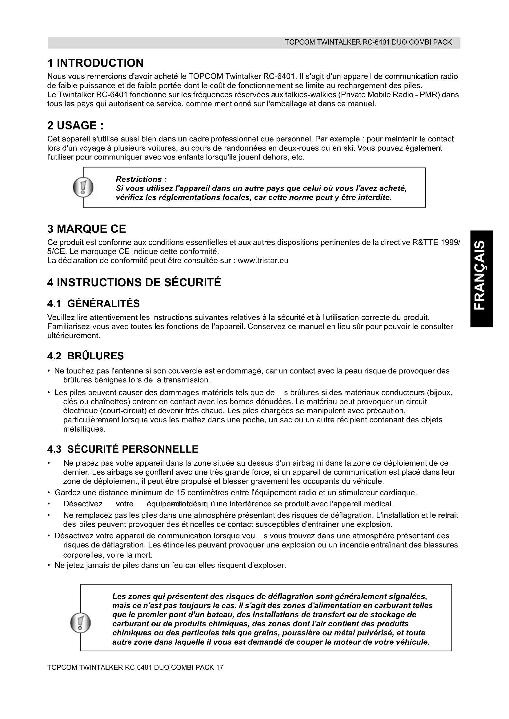 FRANÇAIS 1 INTRODUCTION Nous vous remercions d'avoir acheté le TOPCOM Twintalker RC-6401. Il s'agit d'un appareil de communication radio de faible puissance et de faible portée dont le coût de fonctionnement se limite au rechargement des piles. Le Twintalker RC-6401 fonctionne sur les fréquences réservées a ux talkies-walkies (Private Mobile Radio - PMR) dans tous les pays qui autorisent ce service, comme mentionné sur l'emballage et dans ce manuel. 2 USAGE : Cet appareil s'utilise aussi bien dans un cadre professionnel que personnel. Par exemple : pour maintenir le contact lors d'un voyage à plusieurs voitures, au cours de randonnées en deux-roues ou en ski. Vous pouvez également l'utiliser pour communiquer avec vos enfants lorsqu'ils jouent dehors, etc. Restrictions : Si vous utilisez l'appareil dans un autre pays que celui où vous l'avez acheté, vérifiez les réglementations locales, car cette norme peut y être interdite. 3 MARQUE CE Ce produit est conforme aux conditions essentielles et aux autres dispositions pertinentes de la directive R&TTE 1999/ 5/CE. Le marquage CE indique cette conformité. La déclaration de conformité peut être consultée sur : www.tristar.eu