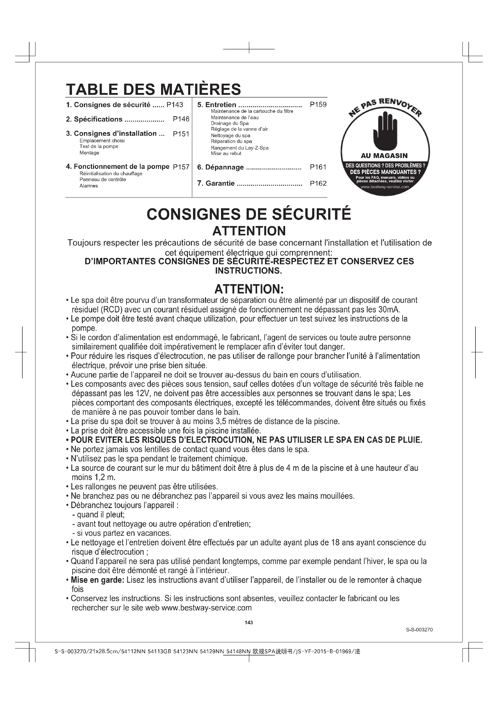S-S-003270 Rangement du Lay-Z-Spa Mise au rebut Vérifiez que le spa et la pompe soient complètement secs. Ceci est fondamental pour prolonger la durée de vie du spa. Nous vous recommandons d’utiliser la pompe pour sécher le spa, la pompe et les tuyaux. Enlevez les groupes filtre et jetez les cartouches de filtre usées. Placez à nouveau les deux bouchons d’obturation sur les vannes d’entrée et de sortie du spa. Il est recommandé de ranger le spa dans son emballage d’origine, au chaud et au sec. DÉPANNAGE Bestway s’efforce de fournir les spas les plus performants sur le marché. Si vous rencontrez néanmoins des problèmes, n'hésitez pas à contacter Bestway ou votre revendeur agréé. Voici quelques astuces utiles pour vous aider à faire un diagnostic et à résoudre les sources de problèmes les plus courantes. Signification du symbole de la poubelle sur roulettes barrée d'une croix : Ne jetez pas les appareils électriques avec les ordures ménagères, mais utilisez le tri sélectif. Contactez votre administration locale pour obtenir des informations sur les systèmes de tri disponibles. Si les appareils électriques sont jetés dans les décharges, des substances dangereuses peuvent se déverser dans la nappe phréatique et pénétrer dans la chaîne alimentaire, avec des conséquences néfastes pour votre santé et votre bien-être. Quand vous remplacez de vieux appareils par des neufs, la loi oblige le distributeur à reprendre votre ancien appareil pour le mettre au rebut au moins gratuitement. REMARQUE: Le plastique devient fragile et risque de se casser quand il est exposé à des températures en dessous de zéro. Le gel peut endommager de manière grave le spa. Un remisage incorrect de votre spa peut rendre la garantie caduque. Problèmes La pompe ne fonctionne pas La pompe ne chauffe pas correctement Le système Lay-Z-Massage ne fonctionne pas Les adaptateurs de la pompe ne sont pas au même niveau que les adaptateurs du spa Fuite au niveau du spa L’eau n’est pas propre Éventuelles causes - Le spa est déchiré ou percé Solutions - Contrôlez la source de courant - Débranchez et rebranchez la pompe - Contactez le service après-vente Bestway le plus proche pour connaître les instructions - Réglez une température supérieure, reportez-vous au paragraphe relatif au fonctionnement de la pompe - Nettoyez/remplacez la cartouche du filtre, reportez-vous au paragraphe relatif au nettoyage et au remplacement de la cartouche du filtre - Ajoutez de l’eau jusqu’aux niveaux indiqués - Appuyez sur le bouton de réinitialisation de la pompe, reportez-vous au paragraphe relatif au fonctionnement de la pompe - Contactez le service après-vente Bestway le plus proche pour connaître les instructions - Débranchez la pompe et attendez deux heures afin que la pompe refroidisse. Branchez la fiche et appuyez sur le Bouton du système Lay-Z-Massage - Appuyez sur le bouton du système Lay-Z-Massage pour le réactiver - Contactez le service après-vente Bestway le plus proche pour connaître les instructions - Rehaussez la pompe avec du bois ou un autre type de matériau isolé pour amener les adaptateurs de la pompe au niveau des adaptateurs du spa - Utilisez la rustine fournie avec - Augmentez le temps de filtration - Nettoyez/remplacez la cartouche du filtre, reportez-vous au paragraphe relatif au nettoyage et au remplacement de la cartouche du filtre - Reportez-vous aux instructions du producteur des produits chimiques - Panne de courant - Le bouton de test est enfoncé - Les circuits d’alimentation sont cassés - La température réglée est trop basse - La cartouche du filtre est sale - Les niveaux d’eau sont incorrects - Le coupe-circuit thermique s’arrête - Panne de l’élément de chauffage - La pompe à air est trop chaude - Le Lay-Z- Spa Massage s’arrête automatiquement - La pompe à air est cassée - La nature du PVC l'amène à changer de forme, ce qui est normal - Temps de filtration insuffisant - La cartouche du filtre est sale - Entretien incorrect de l’eauS-S-003270/21x28.5cm/54112NN 54113GB 54123NN 54129NN 54148NN 欧规SPA说明书/JS-YF-2015-B-01969/质保/法 S-S-003270Le produit que vous avez acheté est accompagné d’une garantie limitée. Bestway défend sa garantie de qualité et assure, grâce à une garantie de remplacement, que votre produit ne présentera pas de vices de fabrication pouvant porter à des fuites. Pour présenter une réclamation dans le cadre de la garantie, il faut remplir ce formulaire qui doit être envoyé au service après-vente Bestway