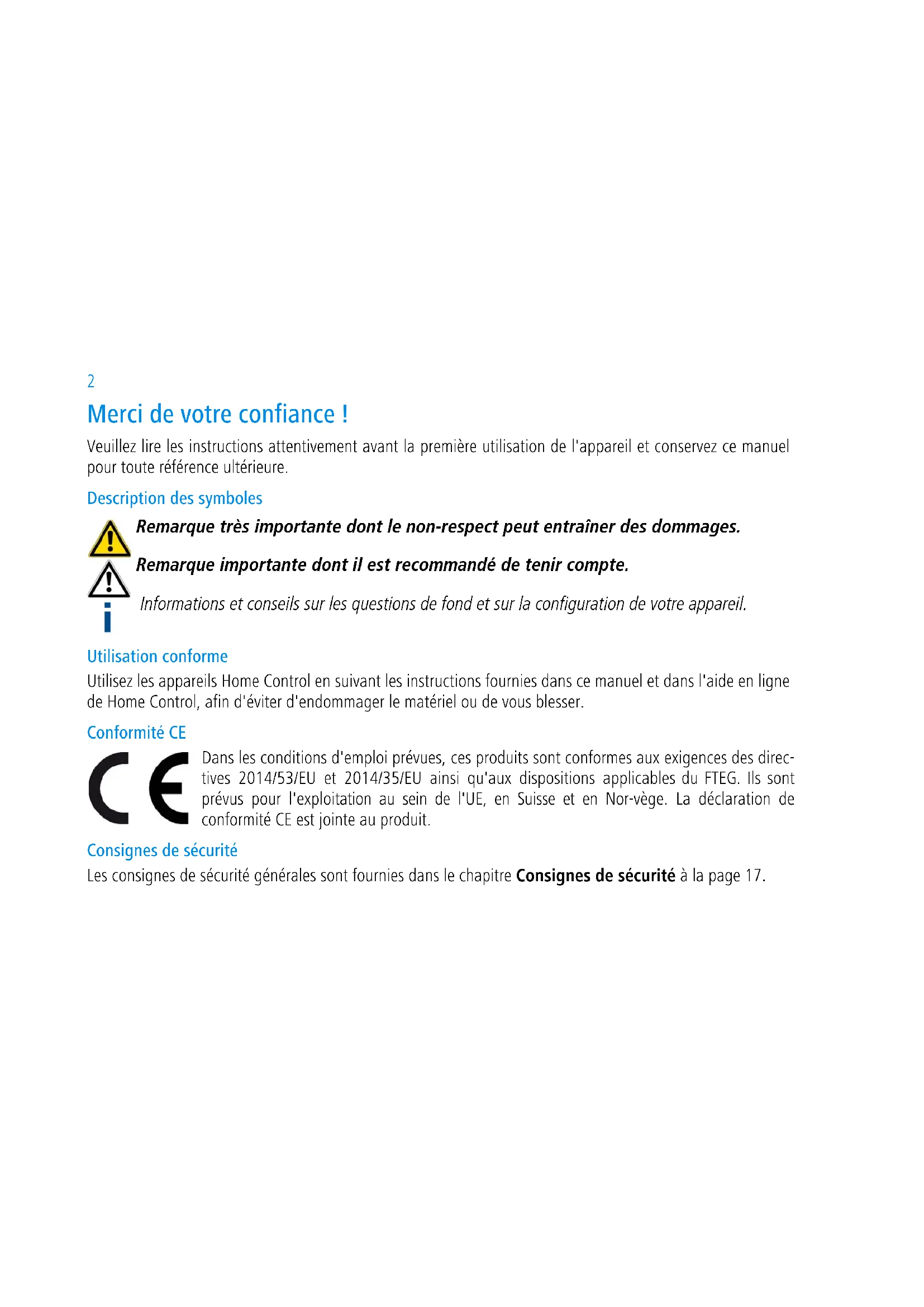 Home Control Kit de démarrage Premiers pas Security ID: wwww-wwww-wwww-wwww S/N: 1405231112222221 Home Control Kit de démarrage Premiers pas2 Merci de votre confiance ! Veuillez lire les instructions attentivement avant la première utilisation de l'appareil et conservez ce manuel pour toute référence ultérieure. Description des symboles Remarque très importante dont le non-respect peut entraîner des dommages. Remarque importante dont il est recommandé de tenir compte. Informations et conseils sur les questions de fond et sur la configuration de votre appareil. Utilisation conforme Utilisez les appareils Home Control en suivant les instructions fournies dans ce manuel et dans l'aide en ligne de Home Control, afin d'éviter d'endommager le matériel ou de vous blesser. Conformité CE Dans les conditions d'emploi prévues, ces produits sont conformes aux exigences des direc- tives 2014/53/EU et 2014/35/EU ainsi qu'aux dispositions applicables du FTEG. Ils sont prévus pour l'exploitation au sein de l'UE, en Suisse et en Nor-vège. La déclaration de conformité CE est jointe au produit. Consignes de sécurité Les consignes de sécurité générales sont fournies dans le chapitre Consignes de sécurité à la page 17.3 Home Control de devolo Home Control (domotique en anglais) désigne l'ensemble des techniques de commande de l'équipement élec- trique dans une maison résidentielle. Le système Home Control de devolo utilise la norme radio Z-Wave