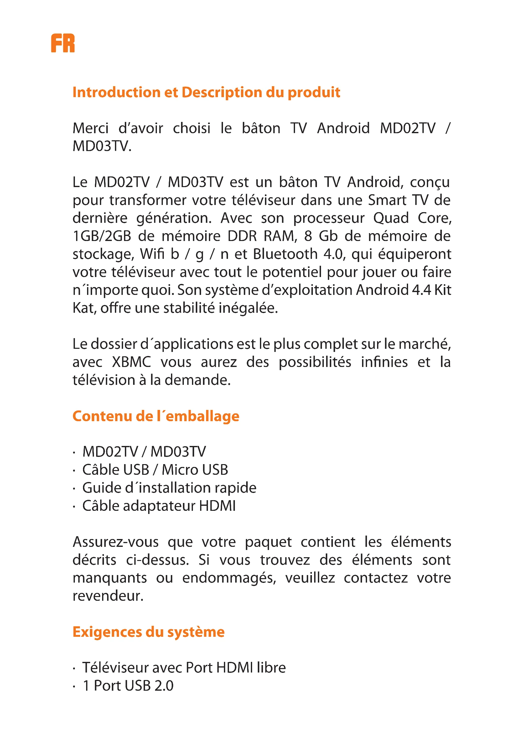 - Por favor, asegúrese de que tanto el MD02TV / MD03TV, tanto como el smartphone se están ejecutando en la misma red Wi.ES Nota: Billow Technoloy no es responsable, ni propietario de las aplicaciones instaladas, ni de su contenido. Por lo cual el mantenimiento de las mismas es de terceras partes no asociadas a la marca. Soporte técnico Por favor para más información sobre la instalación y conguración de este producto diríjase a nuestra web www.billowtechnology.com o escriba un correo electrónico a support@billowtechnology.com.fr Introduction et Description du produit Merci d’avoir choisi le bâton TV Android MD02TV / MD03TV. Le MD02TV / MD03TV est un bâton TV Android, conçu pour transformer votre téléviseur dans une Smart TV de dernière génération. Avec son processeur Quad Core, 1GB/2GB de mémoire DDR RAM, 8 Gb de mémoire de stockage, Wi b / g / n et Bluetooth 4.0, qui équiperont votre téléviseur avec tout le potentiel pour jouer ou faire n´importe quoi. Son système d’exploitation Android 4.4 Kit Kat, ore une stabilité inégalée. Le dossier d´applications est le plus complet sur le marché, avec XBMC vous aurez des possibilités innies et la télévision à la demande. Contenu de l´emballage