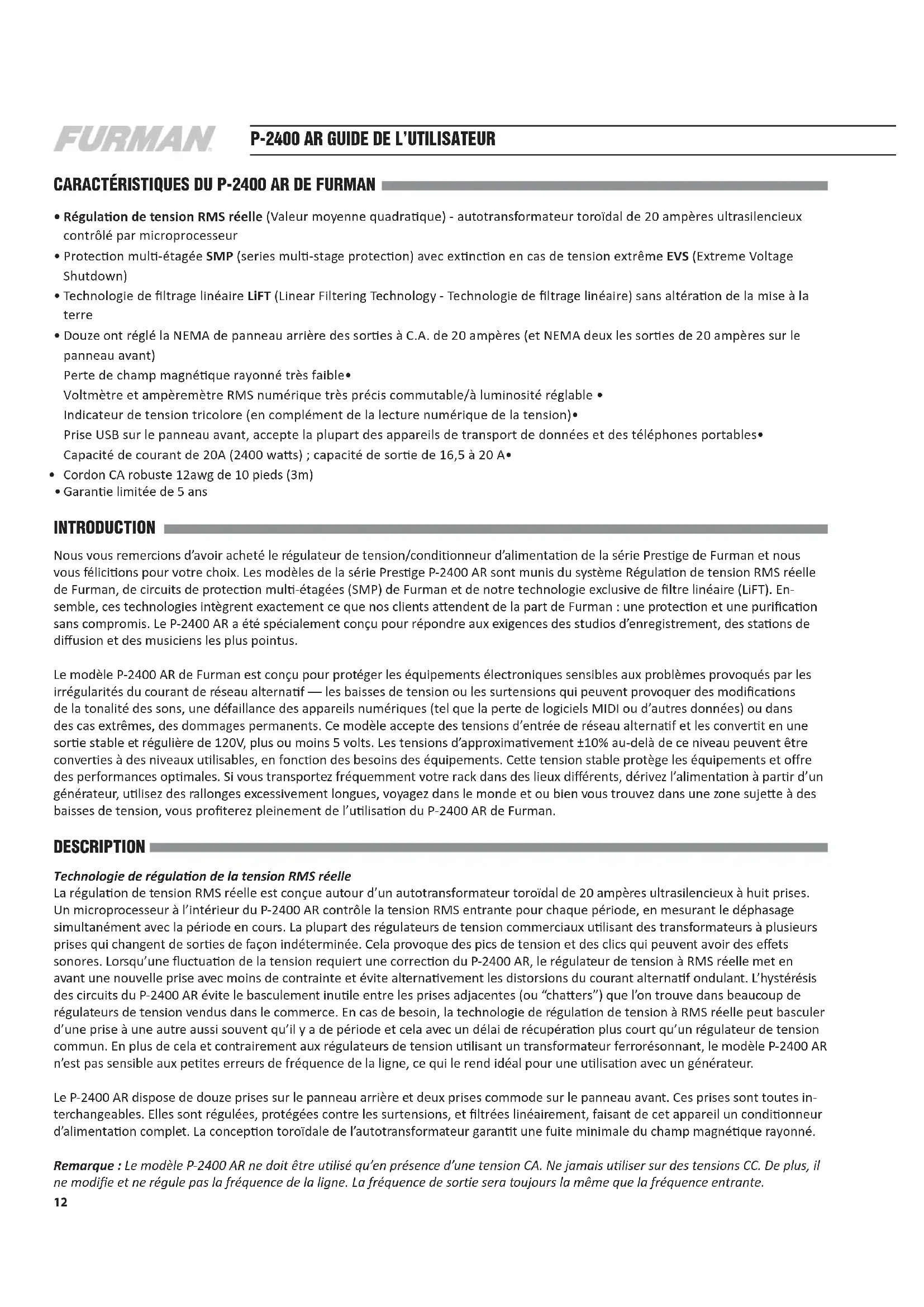 Retrouvez gratuitement la notice de l'appareil P2400 AR Furman au format PDF.