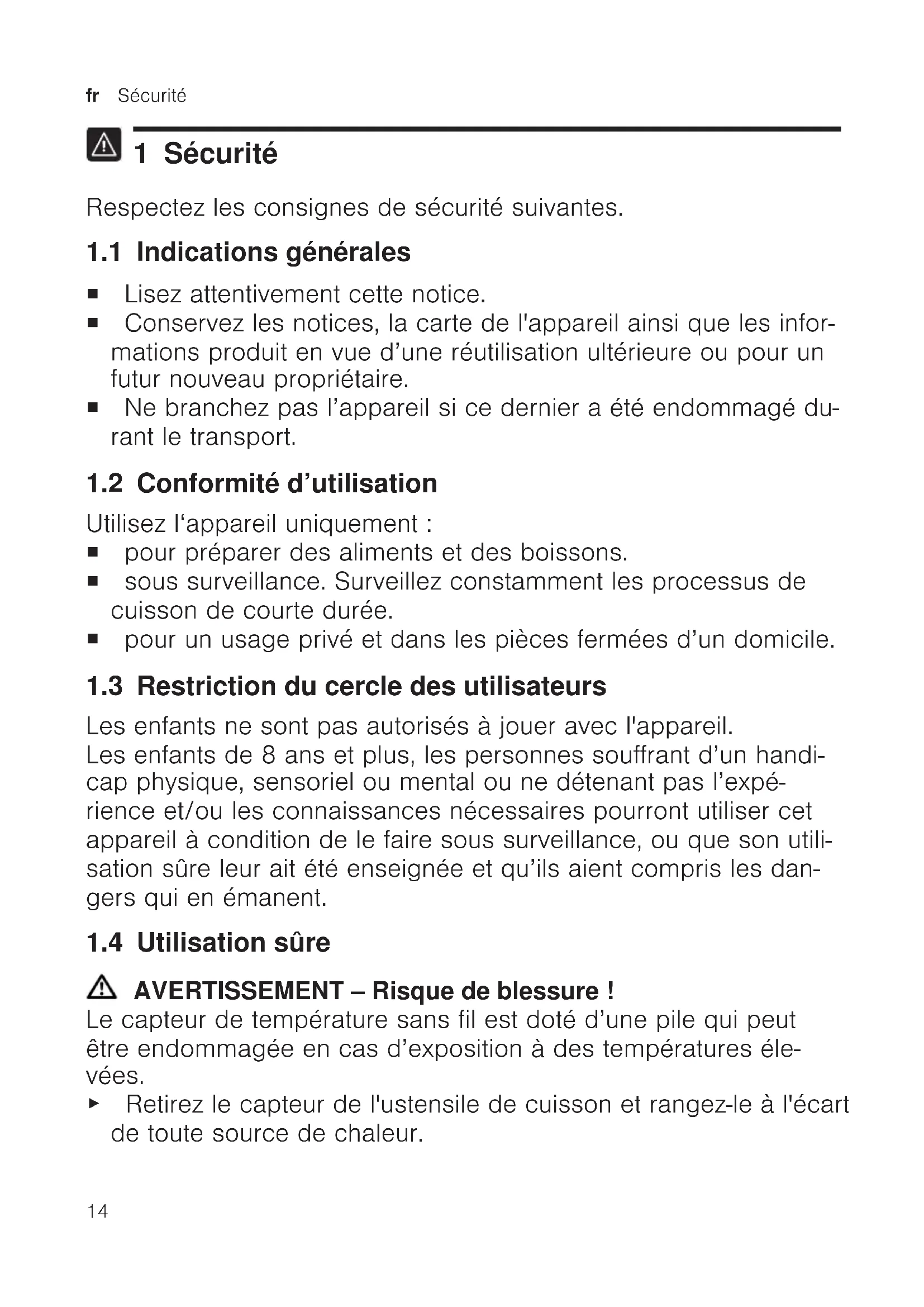 1 Sécurité Respectez les consignes de sécurité suivantes. 1.1 Indications générales ¡ Lisez attentivement cette notice. ¡ Conservez les notices, la carte de l'appareil ainsi que les infor- mations produit en vue d’une réutilisation ultérieure ou pour un futur nouveau propriétaire. ¡ Ne branchez pas l’appareil si ce dernier a été endommagé du- rant le transport. 1.2 Conformité d’utilisation Utilisez l‘appareil uniquement: ¡ pour préparer des aliments et des boissons. ¡ sous surveillance. Surveillez constamment les processus de cuisson de courte durée. ¡ pour un usage privé et dans les pièces fermées d’un domicile. 1.3 Restriction du cercle des utilisateurs Les enfants ne sont pas autorisés à jouer avec l'appareil. Les enfants de 8 ans et plus, les personnes souffrant d’un handi- cap physique, sensoriel ou mental ou ne détenant pas l’expé- rience et/ou les connaissances nécessaires pourront utiliser cet appareil à condition de le faire sous surveillance, ou que son utili- sation sûre leur ait été enseignée et qu’ils aient compris les dan- gers qui en émanent. 1.4 Utilisation sûre AVERTISSEMENT‒Risque de blessure! Le capteur de température sans fil est doté d’une pile qui peut être endommagée en cas d’exposition à des températures éle- vées. ▶ Retirez le capteur de l'ustensile de cuisson et rangez-le à l'écart de toute source de chaleur.Sécurité fr