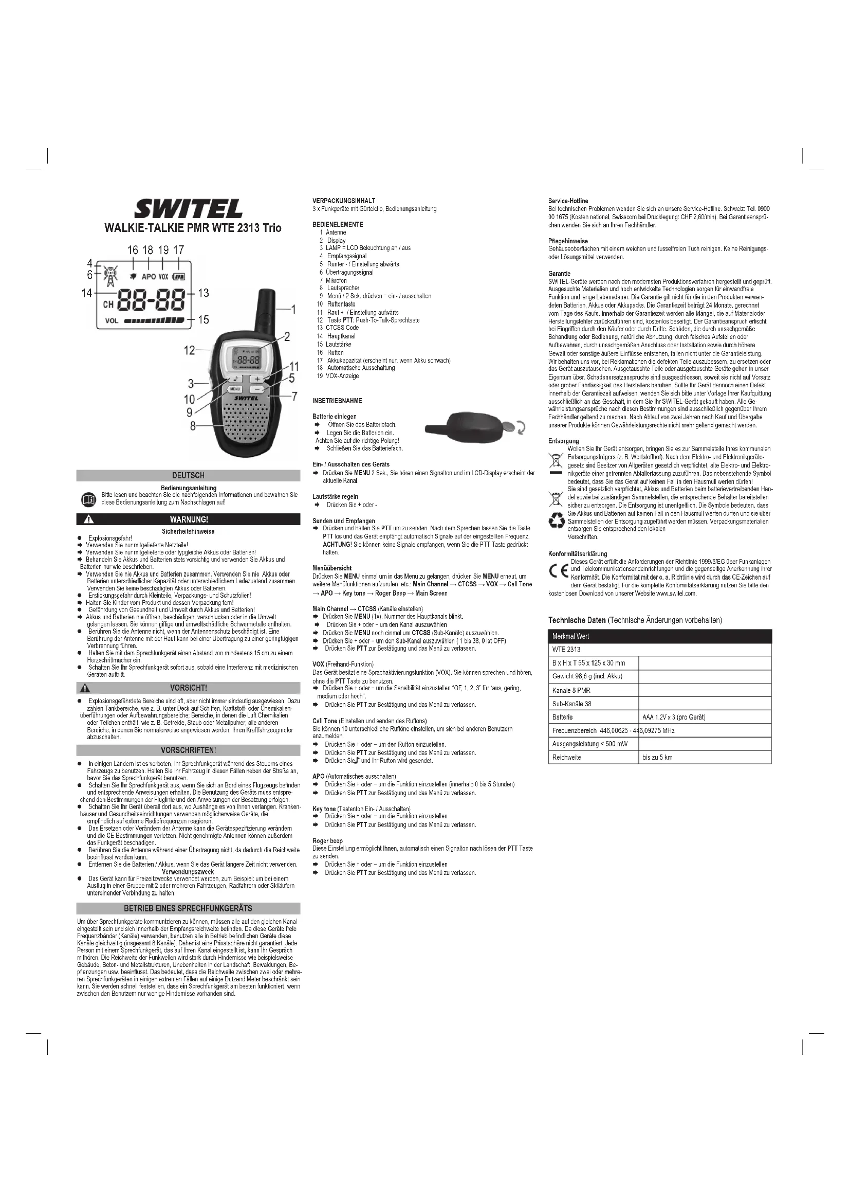 Les apparêts SWITEL sont contrôbés et faççiques suivant les mêncles procdes. Des matériaux sélectiées et des technologiques de pointe leur garantiennent un fondamentement impropochable et une longue durée de vie. La garantie ne s'applique pas aux pless et ples rechçepables utilisées dans les produits. La durée de la garantie est de 24 mois à partir de la date d'achat. Pendant la durée de la garantie, tous les défains dus à des voies de matériel ou de fabrication serontEliminésroidement.Lécroitàla garantie exprime en cas d'intervention d'achateur ou du tiers. Les donnages provenant d'un maniement ou d'une manipulation incorpore, d'une usuro naturale, d'une又一次 mise en place ou d'une maise conservation, d'un raccorredont ou d'une installation incrorecs ainsi que d'un cas de force majorée ou autres influences extérieures sont excult des garanties. En cas de réclamations, nous avons riens le droit de repart, de replaccer les produits defecuteuses ou d'échéanger l'apparèt. Les cornapossants remplèces ou les apparêts échangements deviennent notre propresé. Les demandes de dommages et intérêts sont excults tant que les défains ne reparti sur une fauite intentionnelle ou une négligence grossière du fabricant. Si vous apprairie SWITEL, presente cèpenciant un début pendant la période de garantie, veilliez-vous adresser exclusivementu magasinouvils'evaçanchet enpresentantvoi bon d'achat.Vous ne pouvez fait valor vots droits à la garantie répondant a ces dispositions qu'exclusivement sur toute de vos redevancer.Dous ans après achat et la rentrée de nos produits, il n'est plus possible de faire valoir des droits à la garantie.