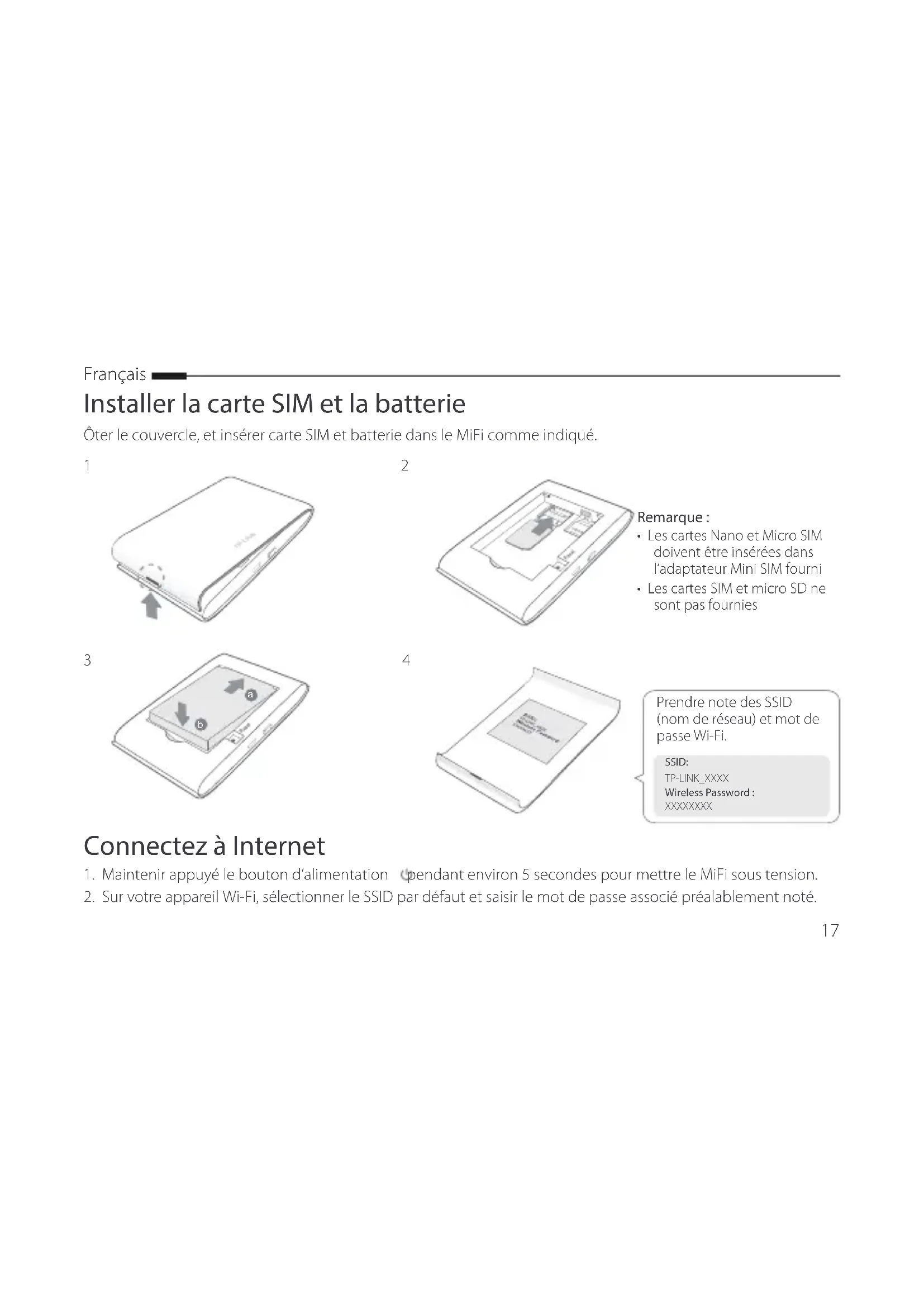 SSID: TP-LINK_XXXX Wireless Password : XXXXXXXX18 Français Remarque : Nous vous recommandons fortement de modier le nom du réseau Wi-Fi et son mot de passe par défaut pour garantir la sécurité du réseau. Appréciez! Remarque :