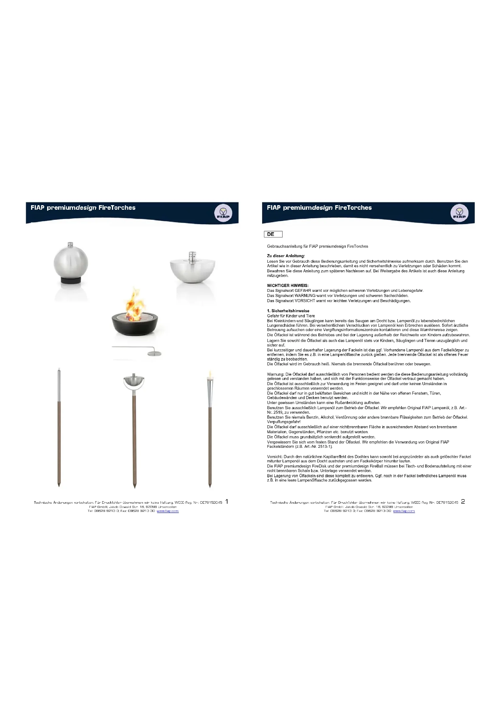 AVERTISSEMENT: La torque ne peut être exploitee par une personne qui a lu et compris ces instructions correctement et a fait lui-meme familiarise avec le mode de fonctionnement de la torque. La torque est uniquement destiné a un usage extérieur. La torque ne doit pas être utilisée dans une piece ou un bâtiment ferme. La torque doit être utilisée uniquement dans des endroits bien ariés et loin des fonctions, portes, murs et toltures. Dans certaines circunstances, la suite peut se developper. Utiliser uniquement de l'huile de la lampe pour faire fonctionner la torque. Nous vous recommendons d'utiliser l'original FIAP LampGel, art. -