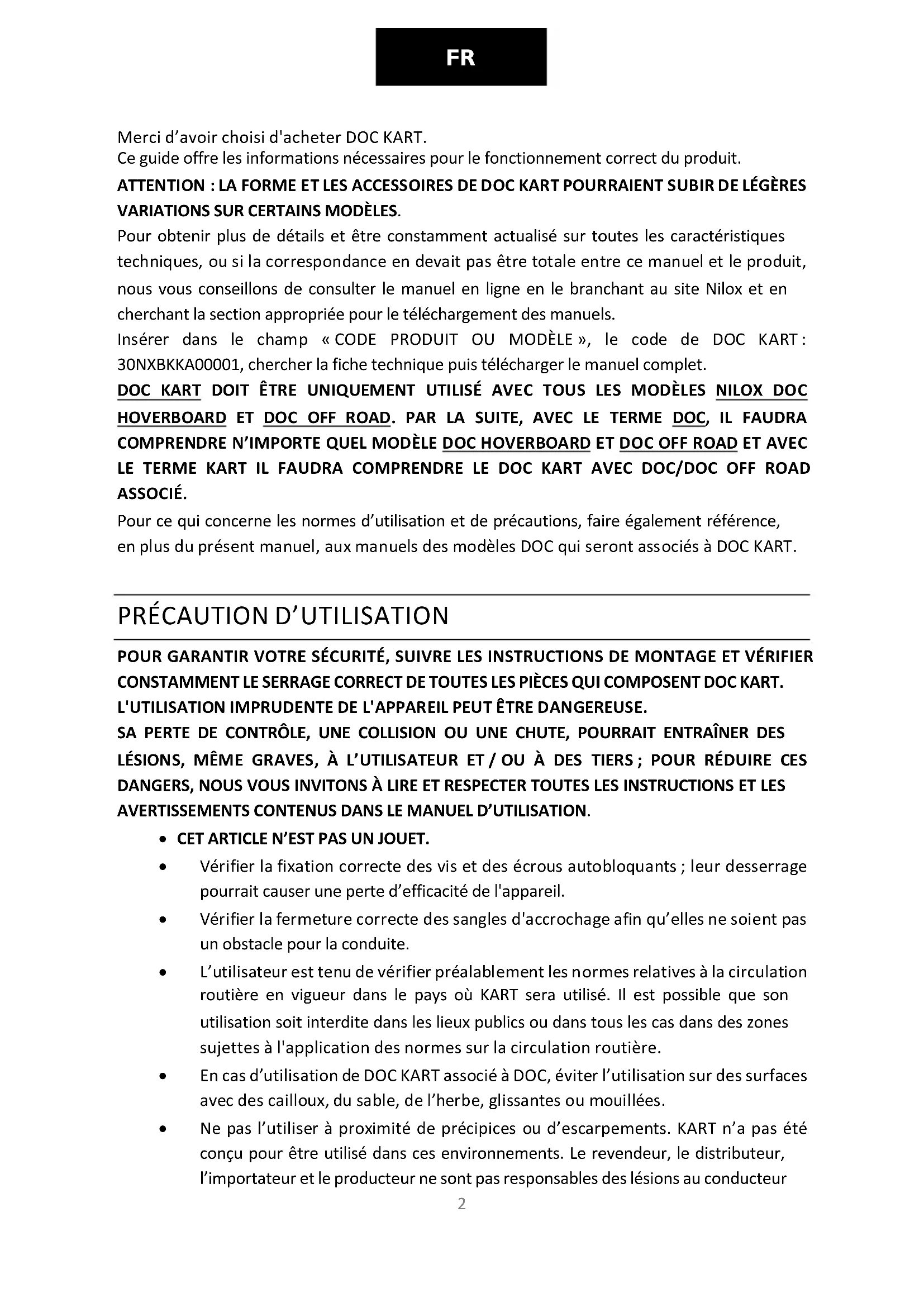 Merci d’avoir choisi d'acheter DOC KART. Ce guide offre les informations nécessaires pour le fonctionnement correct du produit. ATTENTION : LA FORME ET LES ACCESSOIRES DE DOC KART POURRAIENT SUBIR DE LÉGÈRES VARIATIONS SUR CERTAINS MODÈLES. Pour obtenir plus de détails et être constamment actualisé sur toutes les caractéristiques techniques, ou si la correspondance en devait pas être totale entre ce manuel et le produit, nous vous conseillons de consulter le manuel en ligne en le branchant au site Nilox et en cherchant la section appropriée pour le téléchargement des manuels. Insérer dans le champ « CODE PRODUIT OU MODÈLE », le code de DOC KART : 30NXBKKA00001, chercher la fiche technique puis télécharger le manuel complet. DOC KART DOIT ÊTRE UNIQUEMENT UTILISÉ AVEC TOUS LES MODÈLES NILOX DOC HOVERBOARD ET DOC OFF ROAD. PAR LA SUITE, AVEC LE TERME DOC, IL FAUDRA COMPRENDRE N’IMPORTE QUEL MODÈLE DOC HOVERBOARD ET DOC OFF ROAD ET AVEC LE TERME KART IL FAUDRA COMPRENDRE LE DOC KART AVEC DOC/DOC OFF ROAD ASSOCIÉ. Pour ce qui concerne les normes d’utilisation et de précautions, faire également référence, en plus du présent manuel, aux manuels des modèles DOC qui seront associés à DOC KART.