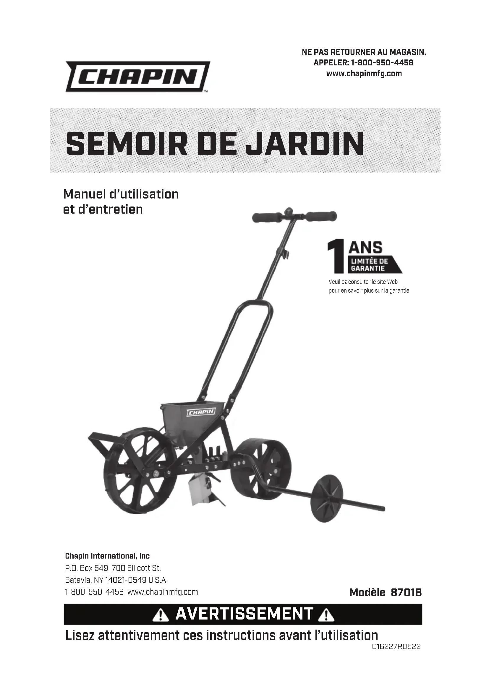 Manual del operador sembradora para jardines Chapin - EspañolSEMOIR DE JARDIN Modèle 8701B Manuel d’utilisation et d’entretien NE PAS RETOURNER AU MAGASIN. APPELER: 1-800-950-4458 www.chapinmfg.comChapin International, IncP.O. Box 549 700 Ellicott St. Batavia, NY 14021-0549 U.S.A. 1-800-950-4458 www.chapinmfg.com 016227R0522 Lisez attentivement ces instructions avant l’utilisation AVERTISSEMENT Veuillez consulter le site Web pour en savoir plus sur la garantie1F Remarque pour l’assemblage :
