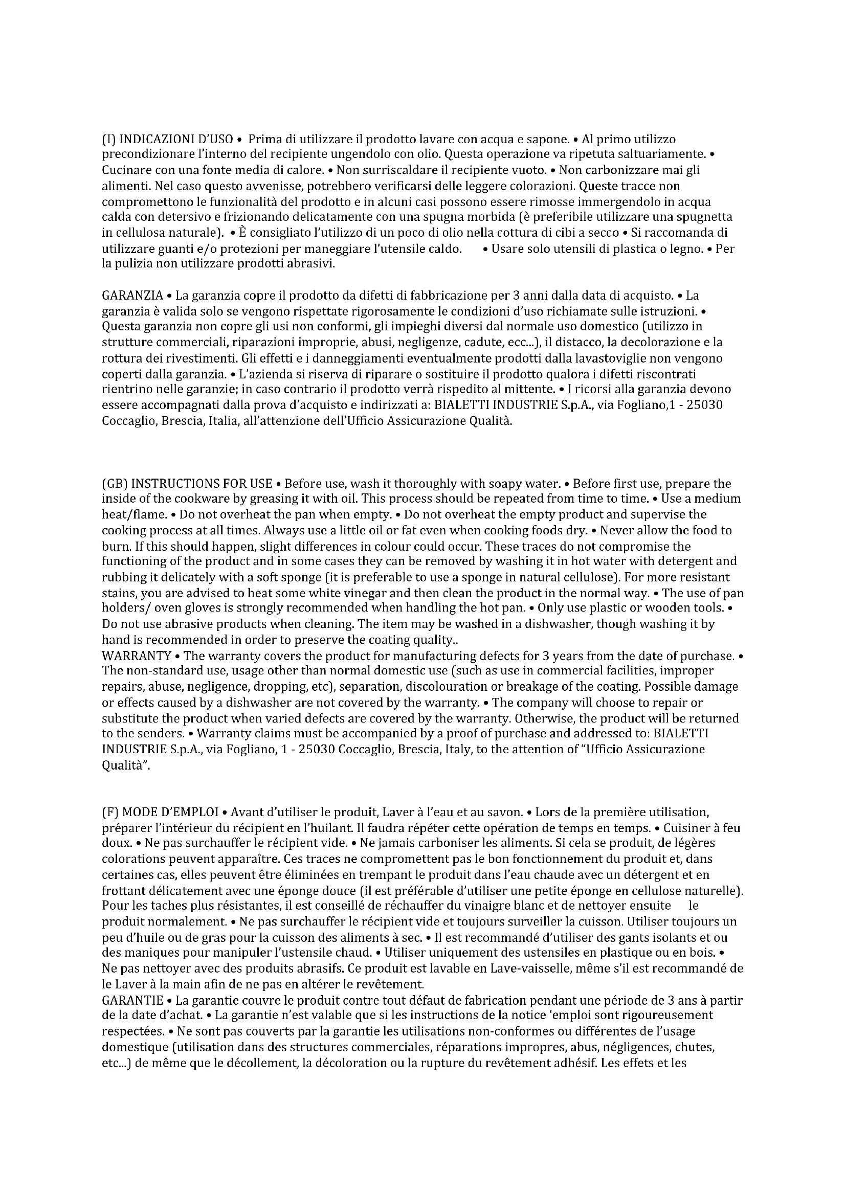 (F) MODE D'EMPLOI • Avant d'utiliser le produit, Laver à l'eau et au savon. • Lors de la première utilisation, préparer l'intérieur du écipient en l'huiant. Il faudra répéter cette opération de temps en temps. • Cuisiner à feu doux. • Ne pas surchauffer le écipient vide. • Ne jamais carboniser les alimentés. Si cela se produit, de légères colorations peuvent apparaitre. Ces traces neompromettent pas le bon fonctionnement du produit et, dans certaines cas, elles peuvent être éliminées en trempant le produit dans l'eau chaude avec un détergent et en frrottant delicatement avec une éponge douce (il est préféable d'utiliser une petite éponge en cellulose naturelle). Pour les taches plus résistantes, il est conseilé de réchauffer du vinaire blanc et de nettoyer ensuite le produit normalement. • Ne pas surchauffer le écipient vide et toujours surveiller la cuisson. Utiliser toujours un peu d'huile ou de gras pour la cuisson des alimentés à sec. • Il est recommendé d'utiliser des gants isolants et ou des maniques pour manipuler l'ustensile chaud. • Utiliser uniquement des ustensiles en plastique ou en bois. • Ne pas nettoyer avec des produits abrasifs. Ce produit est lavable en Lave-vaisse, même s'il est recommandé de le Laver à la main afin de ne pas en ALTERER le revêtement.