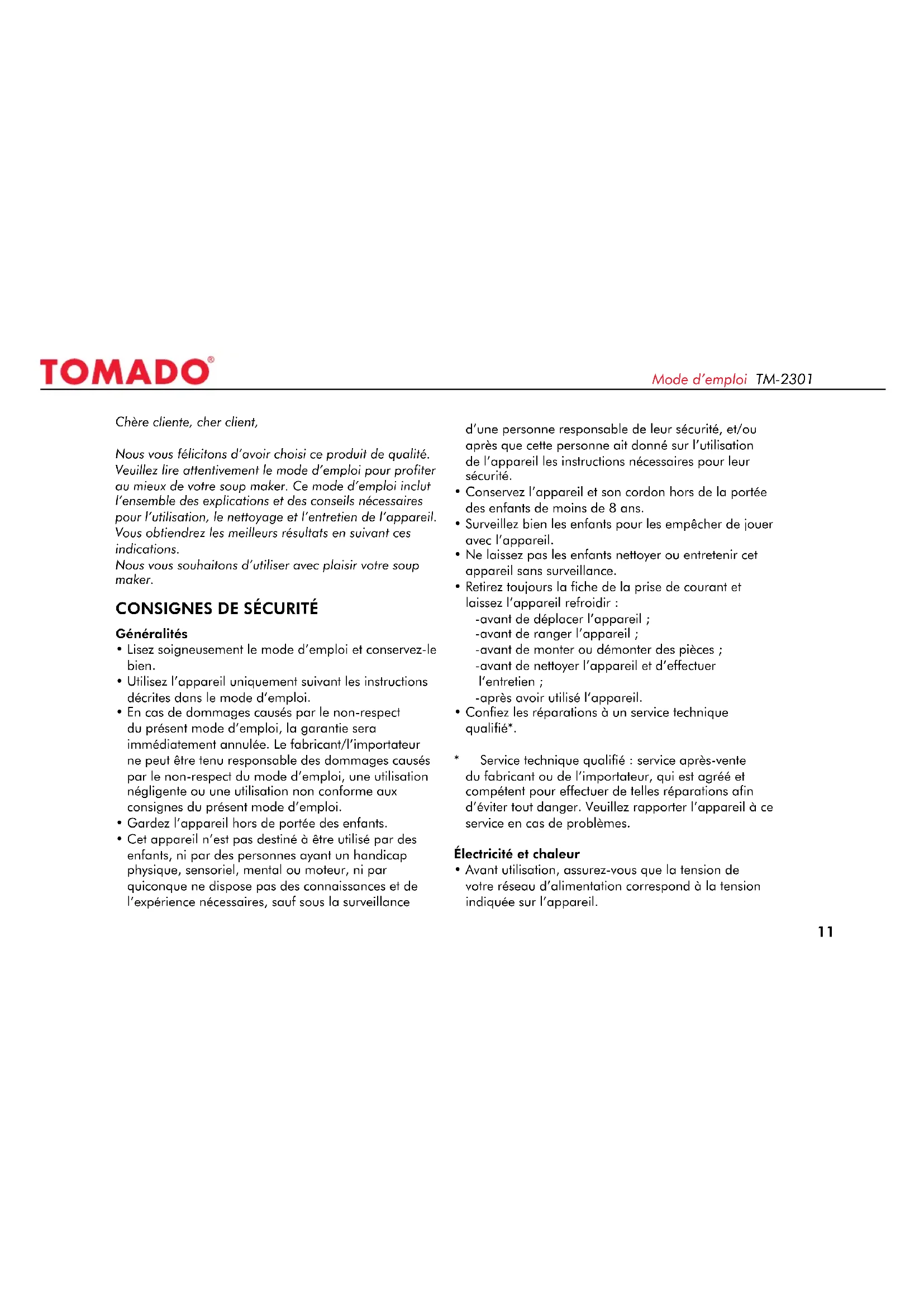 MODE D'EMPLOI TM 2301 Tomado