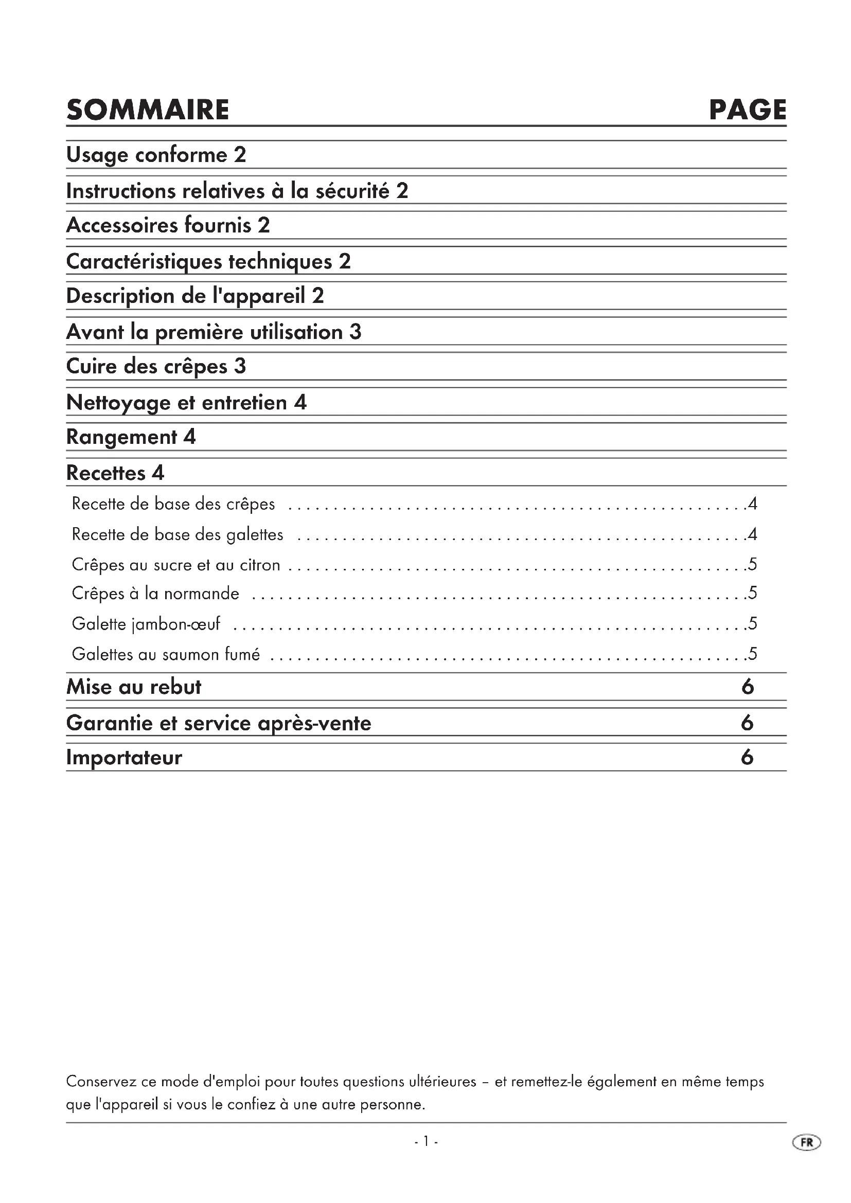 - CV_KH1137_E4906_LB2.qxd 14.08.2008 10:48 Uhr Seite 4- 1 - SOMMAIRE PAGE Usage conforme 2 Instructions relatives à la sécurité 2 Accessoires fournis 2 Caractéristiques techniques 2 Description de l'appareil 2 Avant la première utilisation 3 Cuire des crêpes 3 Nettoyage et entretien 4 Rangement 4 Recettes 4 Recette de base des crêpes p. 4