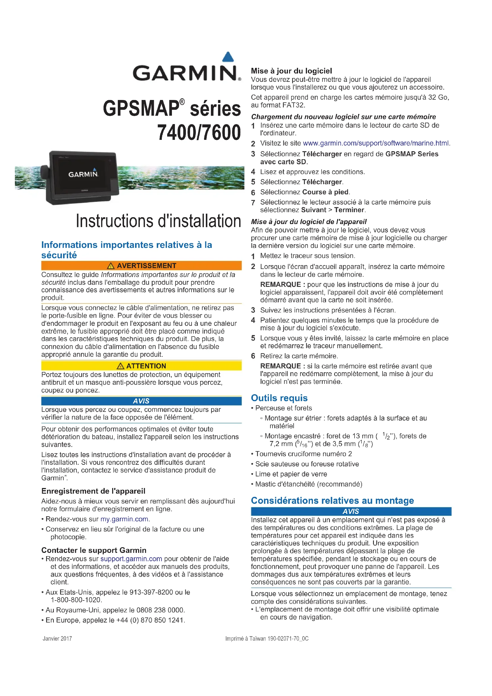 séries 7400/7600 Instructions d'installation Informations importantes relatives à la sécurité AVERTISSEMENTConsultez le guide Informations importantes sur le produit et la sécurité inclus dans l'emballage du produit pour prendre connaissance des avertissements et autres informations sur le produit.Lorsque vous connectez le câble d'alimentation, ne retirez pas le porte-fusible en ligne. Pour éviter de vous blesser ou d'endommager le produit en l'exposant au feu ou à une chaleur extrême, le fusible approprié doit être placé comme indiqué dans les caractéristiques techniques du produit. De plus, la connexion du câble d'alimentation en l'absence du fusible approprié annule la garantie du produit. ATTENTIONPortez toujours des lunettes de protection, un équipement antibruit et un masque anti-poussière lorsque vous percez, coupez ou poncez. AVIS Lorsque vous percez ou coupez, commencez toujours par vérifier la nature de la face opposée de l'élément.Pour obtenir des performances optimales et éviter toute détérioration du bateau, installez l'appareil selon les instructions suivantes.Lisez toutes les instructions d'installation avant de procéder à l'installation. Si vous rencontrez des difficultés durant l'installation, contactez le service d'assistance produit de Garmin