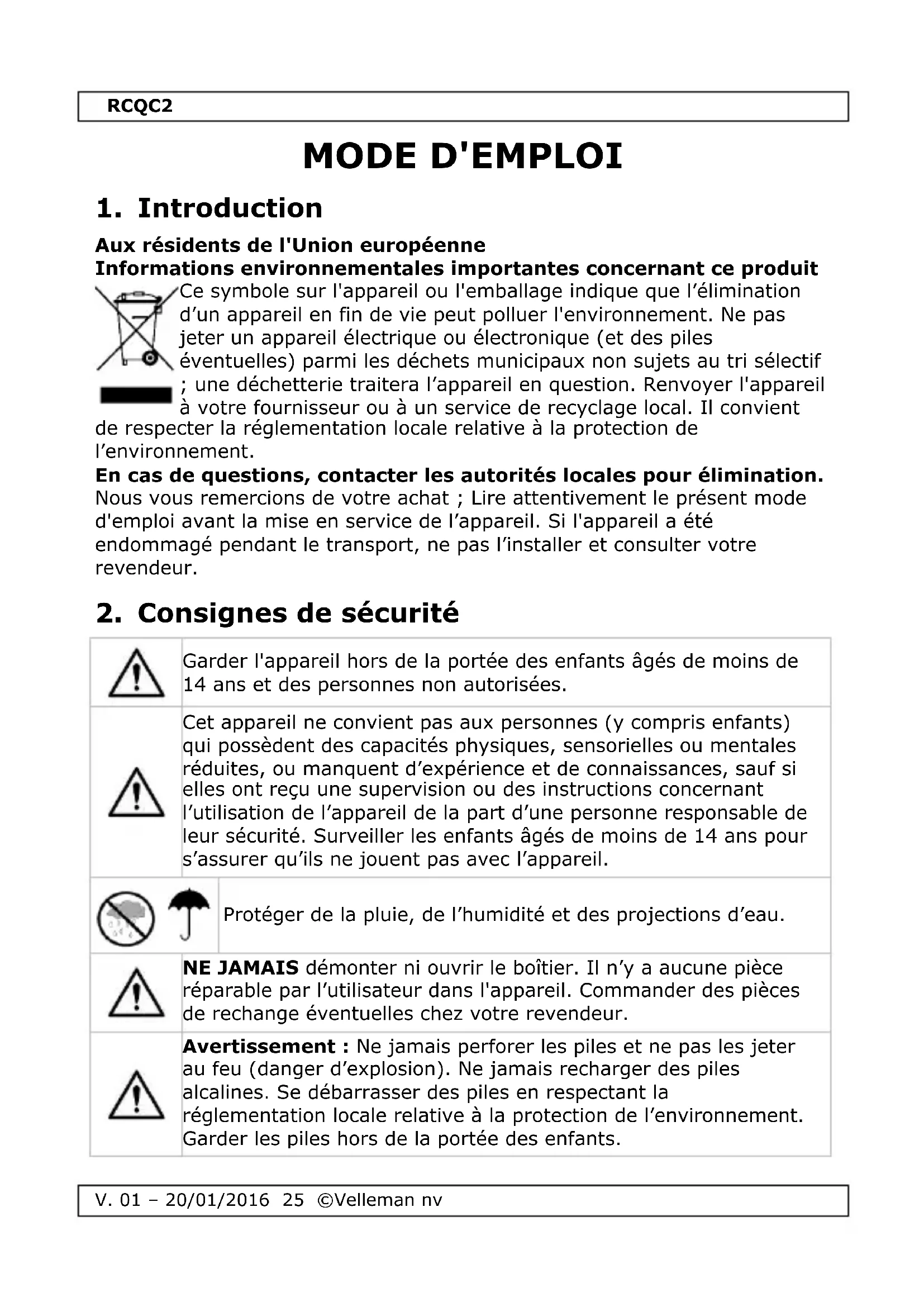 Retrouvez gratuitement la notice de l'appareil RCQC2 VELLEMAN au format PDF.