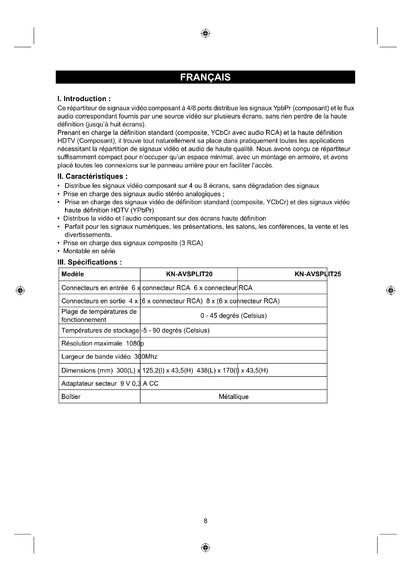 Modèle KN-AVSPLIT20 KN-AVSPLIT25 Connecteurs en entrée 6 x connecteur RCA 6 x connecteur RCA Connecteurs en sortie 4 x (6 x connecteur RCA) 8 x (6 x connecteur RCA) Plage de températures de fonctionnement