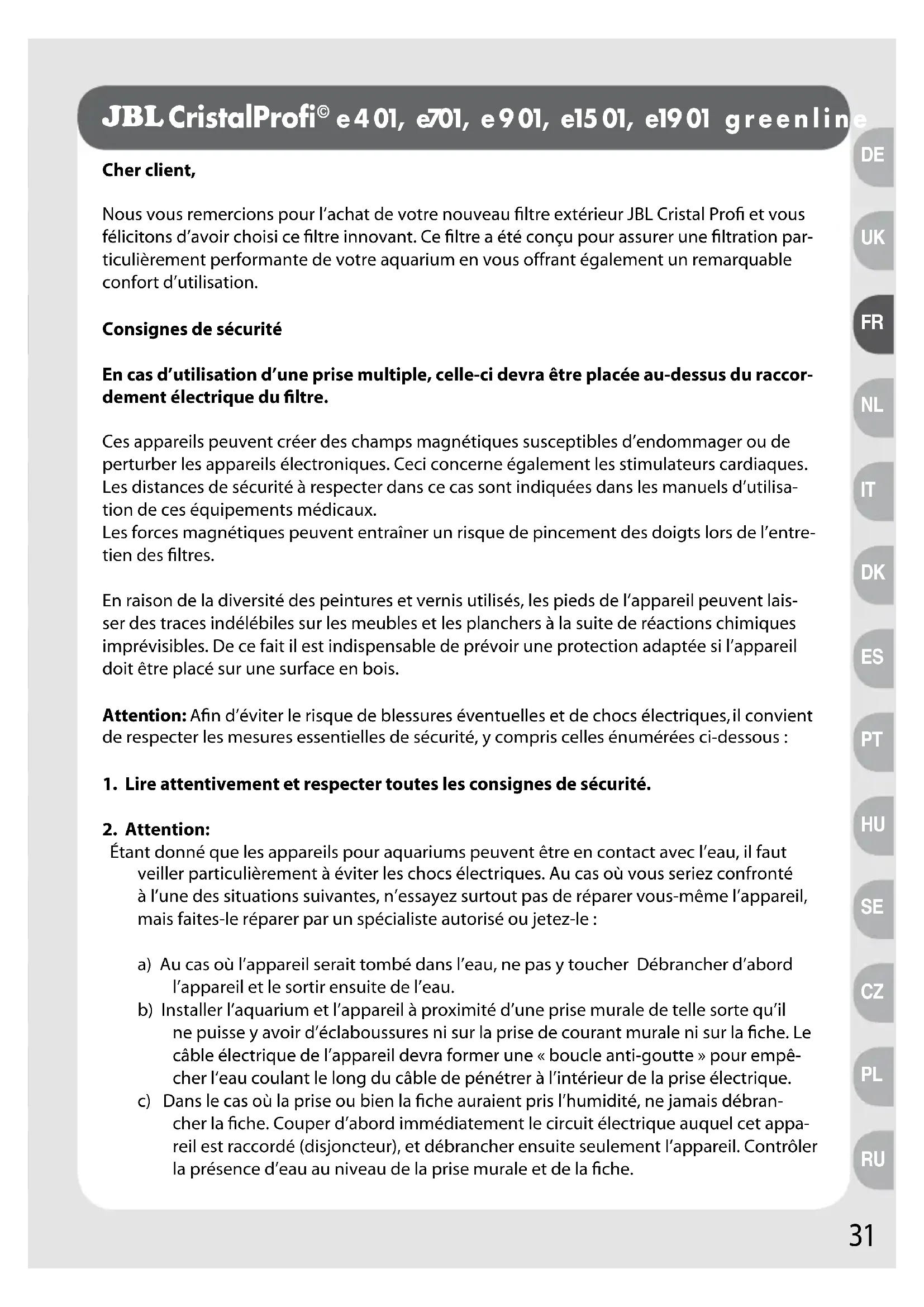 Serial No _ _ - _ _- _ _ _ _ _ Purchase date: _ _ / _ _ / _ _ (please include purchase receipt, which will be returned with the appliance) Reason for claim: Date:................................................ Signature:................................................ Space for purchase receipt:31 Cher client,Nous vous remercions pour l’achat de votre nouveau filtre extérieur JBL Cristal Profi et vous félicitons d’avoir choisi ce filtre innovant. Ce filtre a été conçu pour assurer une filtration par-ticulièrement performante de votre aquarium en vous offrant également un remarquable confort d’utilisation.Consignes de sécurité En cas d’utilisation d’une prise multiple, celle-ci devra être placée au-dessus du raccor-dement électrique du filtre.Ces appareils peuvent créer des champs magnétiques susceptibles d’endommager ou de perturber les appareils électroniques. Ceci concerne également les stimulateurs cardiaques. Les distances de sécurité à respecter dans ce cas sont indiquées dans les manuels d’utilisa-tion de ces équipements médicaux. Les forces magnétiques peuvent entraîner un risque de pincement des doigts lors de l’entre-tien des filtres. En raison de la diversité des peintures et vernis utilisés, les pieds de l’appareil peuvent lais-ser des traces indélébiles sur les meubles et les planchers à la suite de réactions chimiques imprévisibles. De ce fait il est indispensable de prévoir une protection adaptée si l’appareil doit être placé sur une surface en bois. Attention: Afin d’éviter le risque de blessures éventuelles et de chocs électriques, il convient de respecter les mesures essentielles de sécurité, y compris celles énumérées ci-dessous :1. Lire attentivement et respecter toutes les consignes de sécurité. 2. Attention: Étant donné que les appareils pour aquariums peuvent être en contact avec l’eau, il faut veiller particulièrement à éviter les chocs électriques. Au cas où vous seriez confronté à l’une des situations suivantes, n’essayez surtout pas de réparer vous-même l’appareil, mais faites-le réparer par un spécialiste autorisé ou jetez-le : a) Au cas où l’appareil serait tombé dans l’eau, ne pas y toucher Débrancher d’abord l’appareil et le sortir ensuite de l’eau. b) Installer l’aquarium et l’appareil à proximité d’une prise murale de telle sorte qu’il ne puisse y avoir d’éclaboussures ni sur la prise de courant murale ni sur la fiche. Le câble électrique de l’appareil devra former une « boucle anti-goutte » pour empê-cher l‘eau coulant le long du câble de pénétrer à l’intérieur de la prise électrique.c) Dans le cas où la prise ou bien la fiche auraient pris l’humidité, ne jamais débran-cher la fiche. Couper d’abord immédiatement le circuit électrique auquel cet appa-reil est raccordé (disjoncteur), et débrancher ensuite seulement l’appareil. Contrôler la présence d’eau au niveau de la prise murale et de la fiche. JBL CristalProfi