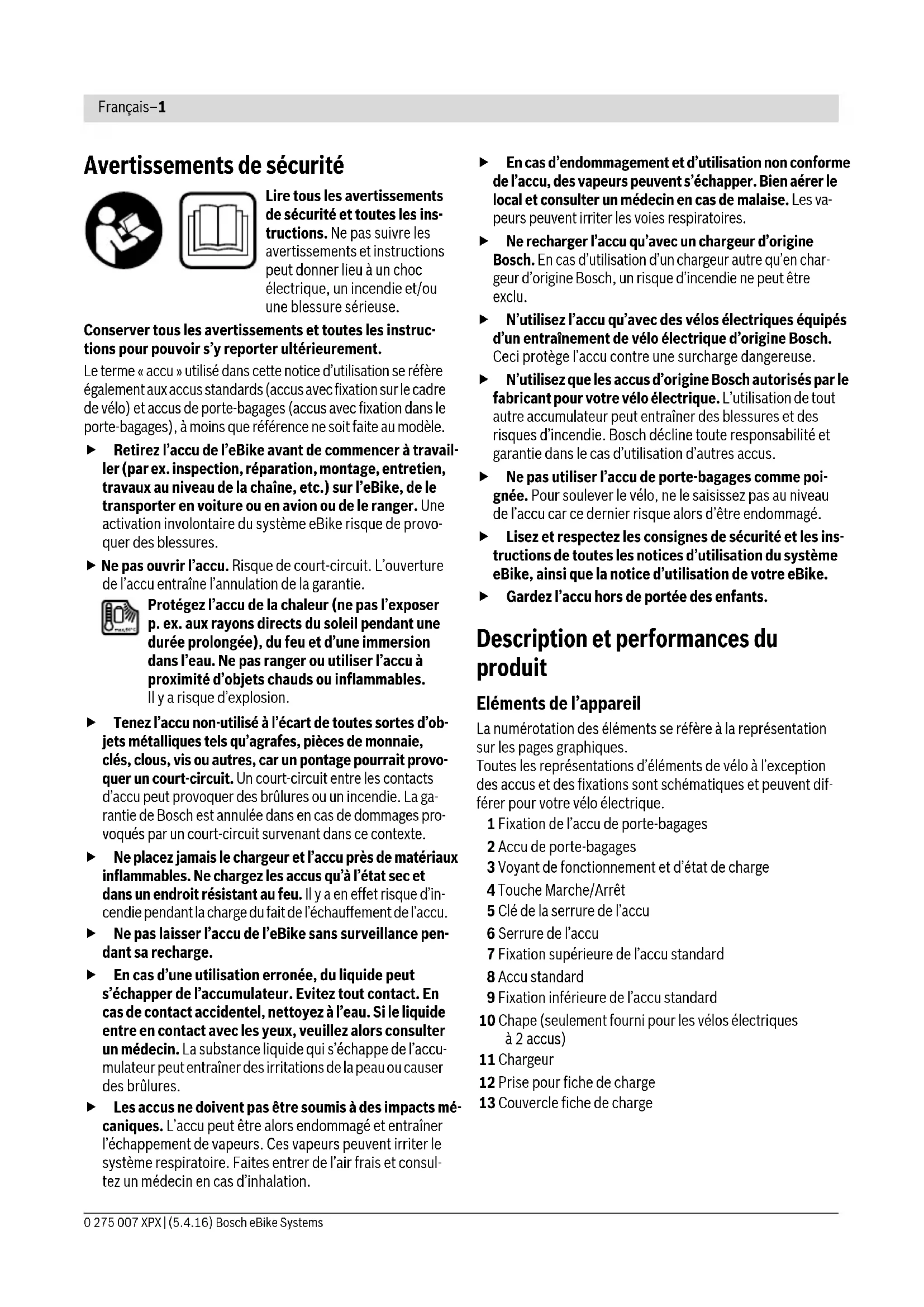 bicycle dealer. Please provide the name of the manufactur- er and the number of the key. For contact data of authorised Bosch eBike dealers, please refer to www.bosch-ebike.com Transport If you carry your eBike outside of your car, e.g. on a lug- gage rack, remove the eBike battery pack in order to avoid damaging it. The battery packs are subject to the Dangerous Goods Legis- lation requirements. Private users can transport undamaged battery packs by road without further requirements. When being transported by commercial users or third parties (e.g. air transport or forwarding agency), special require- ments on packaging and labelling must be observed (e.g. ADR regulations). If necessary, an expert for hazardous materials can be consulted when preparing the item for shipping. Dispatch battery packs only when the housing is undamaged. Tape or mask off open contacts and pack up the battery pack in such a manner that it cannot move around in the packaging. Inform your parcel service that the package contains danger- ous goods. Please also observe the possibility of more de- tailed national regulations. In case of questions concerning transport of the battery packs, please refer to an authorised Bosch eBike dealer. The Bosch eBike dealers can also provide suitable transport pack- aging. Disposal Battery packs, accessories and packaging should be sorted for environmental-friendly recycling. Do not dispose of the battery packs into household waste! Tape or mask off the contact surfaces of the battery pack’s terminals with adhesive tape before disposing of battery packs. Only for EC countries: According to the European Guideline 2012/19/EU, electrical devices/tools that are no longer usable, and according to the European Guideline 2006/66/EC, defective or used bat- tery packs/batteries, must be collected sepa- rately and disposed of in an environmentally cor- rect manner. Please return battery packs that are no longer usable to an authorised bicycle dealer. Li-ion: Please observe the instructions in section “Transport”, page English–4. Subject to change without notice.Français–1 0 275 007 XPX | (5.4.16) Bosch eBike Systems Avertissements de sécurité Lire tous les avertissements de sécurité et toutes les ins- tructions. Ne pas suivre les avertissements et instructions peut donner lieu à un choc électrique, un incendie et/ou une blessure sérieuse. Conserver tous les avertissements et toutes les instruc- tions pour pouvoir s’y reporter ultérieurement. Le terme « accu » utilisé dans cette notice d’utilisation se réfère également aux accus standards (accus avec fixation sur le cadre de vélo) et accus de porte-bagages (accus avec fixation dans le porte-bagages), à moins que référence ne soit faite au modèle. Retirez l’accu de l’eBike avant de commencer à travail- ler (par ex. inspection, réparation, montage, entretien, travaux au niveau de la chaîne, etc.) sur l’eBike, de le transporter en voiture ou en avion ou de le ranger. Une activation involontaire du système eBike risque de provo- quer des blessures. Ne pas ouvrir l’accu. Risque de court-circuit. L’ouverture de l’accu entraîne l’annulation de la garantie. Protégez l’accu de la chaleur (ne pas l’exposer p. ex. aux rayons directs du soleil pendant une durée prolongée), du feu et d’une immersion dans l’eau. Ne pas ranger ou utiliser l’accu à proximité d’objets chauds ou inflammables. Il y a risque d’explosion. Tenez l’accu non-utilisé à l’écart de toutes sortes d’ob- jets métalliques tels qu’agrafes, pièces de monnaie, clés, clous, vis ou autres, car un pontage pourrait provo- quer un court-circuit. Un court-circuit entre les contacts d’accu peut provoquer des brûlures ou un incendie. La ga- rantie de Bosch est annulée dans en cas de dommages pro- voqués par un court-circuit survenant dans ce contexte. Ne placez jamais le chargeur et l’accu près de matériaux inflammables. Ne chargez les accus qu’à l’état sec et dans un endroit résistant au feu. Il y a en effet risque d’in- cendie pendant la charge du fait de l’échauffement de l’accu. Ne pas laisser l’accu de l’eBike sans surveillance pen- dant sa recharge. En cas d’une utilisation erronée, du liquide peut s’échapper de l’accumulateur. Evitez tout contact. En cas de contact accidentel, nettoyez à l’eau. Si le liquide entre en contact avec les yeux, veuillez alors consulter un médecin. La substance liquide qui s’échappe de l’accu- mulateur peut entraîner des irritations de la peau ou causer des brûlures. Les accus ne doivent pas être soumis à des impacts mé- caniques. L’accu peut être alors endommagé et entraîner l’échappement de vapeurs. Ces vapeurs peuvent irriter le système respiratoire. Faites entrer de l’air frais et consul- tez un médecin en cas d’inhalation. En cas d’endommagement et d’utilisation non conforme de l’accu, des vapeurs peuvent s’échapper. Bien aérer le local et consulter un médecin en cas de malaise. Les va- peurs peuvent irriter les voies respiratoires. Ne recharger l’accu qu’avec un chargeur d’origine Bosch. En cas d’utilisation d’un chargeur autre qu’en char- geur d’origine Bosch, un risque d’incendie ne peut être exclu. N’utilisez l’accu qu’avec des vélos électriques équipés d’un entraînement de vélo électrique d’origine Bosch. Ceci protège l’accu contre une surcharge dangereuse. N’utilisez que les accus d’origine Bosch autorisés par le fabricant pour votre vélo électrique. L’utilisation de tout autre accumulateur peut entraîner des blessures et des risques d’incendie. Bosch décline toute responsabilité et garantie dans le cas d’utilisation d’autres accus. Ne pas utiliser l’accu de porte-bagages comme poi- gnée. Pour soulever le vélo, ne le saisissez pas au niveau de l’accu car ce dernier risque alors d’être endommagé. Lisez et respectez les consignes de