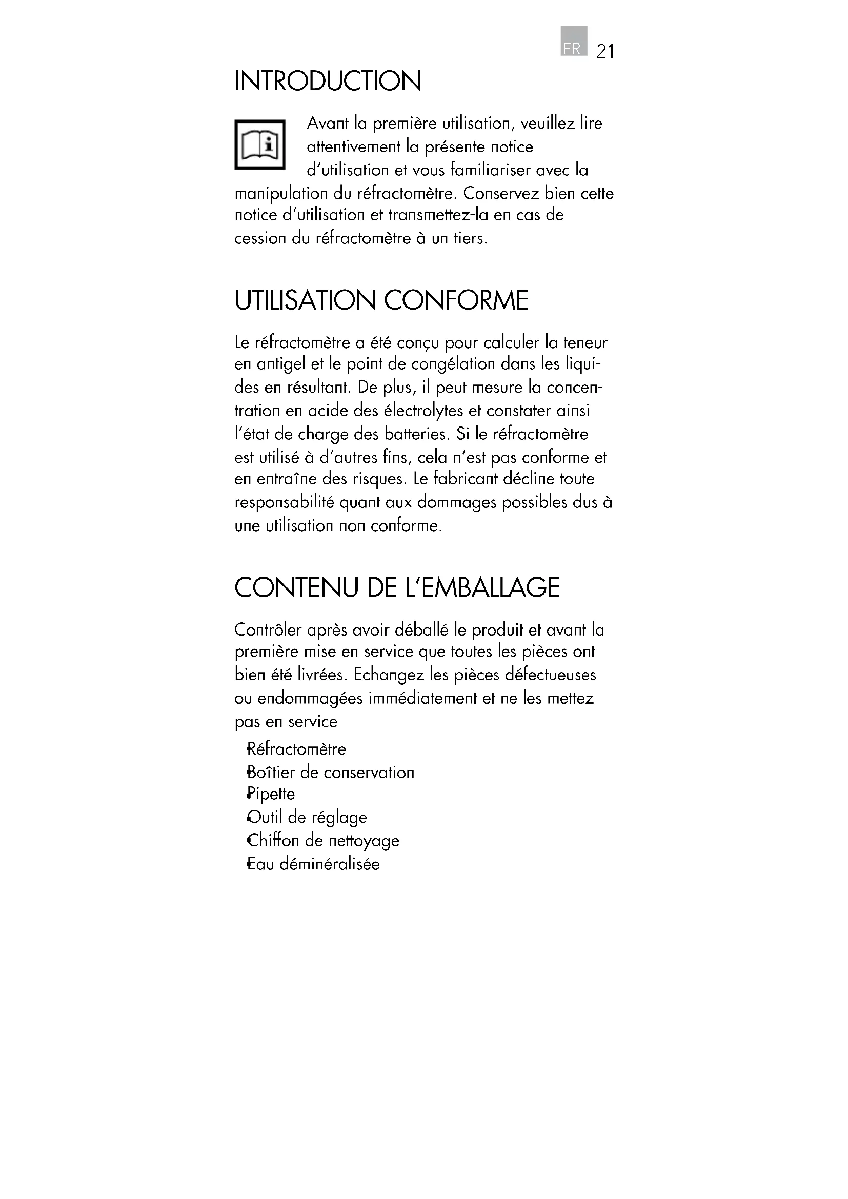 INTRODUCTION Avant la première utilisation, veuillez lire attentivement la présente notice d‘utilisation et vous familiariser avec la manipulation du réfractomètre. Conservez bien cette notice d‘utilisation et transmettez-la en cas de cession du réfractomètre à un tiers. UTILISATION CONFORME Le réfractomètre a été conçu pour calculer la teneur en antigel et le point de congélation dans les liqui- des en résultant. De plus, il peut mesure la concen- tration en acide des électrolytes et constater ainsi l‘état de charge des batteries. Si le réfractomètre est utilisé à d‘autres fins, cela n‘est pas conforme et en entraîne des risques. Le fabricant décline toute responsabilité quant aux dommages possibles dus à une utilisation non conforme.