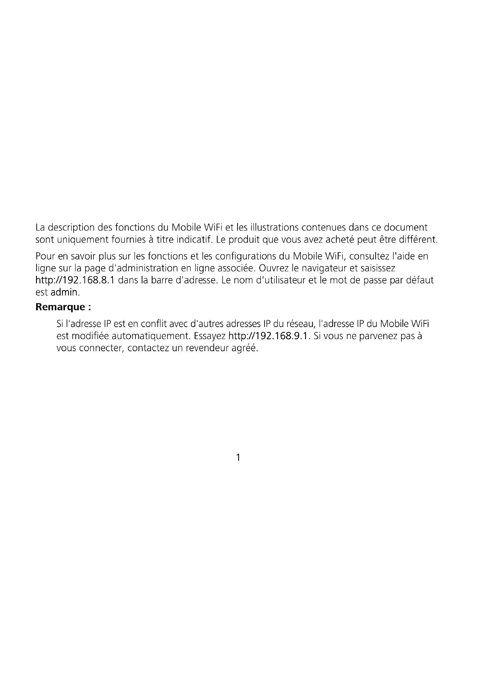 SSID and Wireless Network Encryption Key When a Wi-Fi device establishes a connection to the Mobile WiFi for the first time, you may need to enter the default Service Set Identifier (SSID) and wireless network encryption key. The default SSID and encryption key are printed on the Mobile WiFi label. It is recommended that you can log in to the web management page and change your SSID and wireless network encryption key.Démarrage rapide1 La description des fonctions du Mobile WiFi et les illustrations contenues dans ce document sont uniquement fournies à titre indicatif. Le produit que vous avez acheté peut être différent. Pour en savoir plus sur les fonctions et les configurations du Mobile WiFi, consultez l'aide en ligne sur la page d'administration en ligne associée. Ouvrez le navigateur et saisissez http://192.168.8.1 dans la barre d'adresse. Le nom d'utilisateur et le mot de passe par défaut est admin. Remarque : Si l'adresse IP est en conflit avec d'autres adresses IP du réseau, l'adresse IP du Mobile WiFi est modifiée automatiquement. Essayez http://192.168.9.1. Si vous ne parvenez pas à vous connecter, contactez un revendeur agréé.2 Apparence