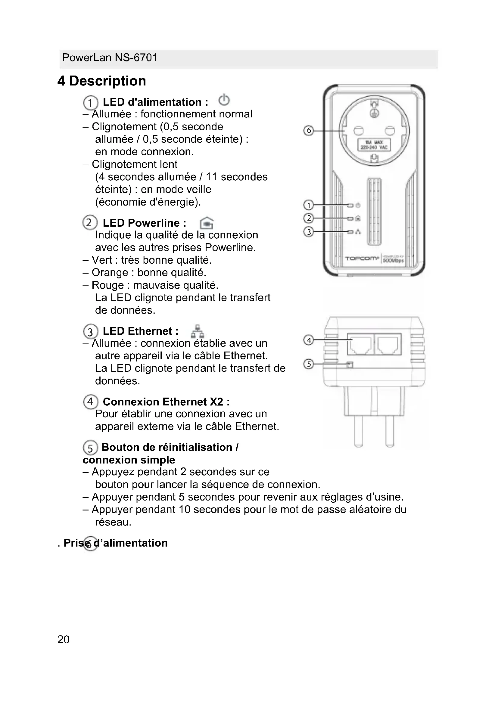 4 Description LED d'alimentation : – Allumée : fonctionnement normal – Clignotement (0,5 seconde allumée / 0,5 seconde éteinte) : en mode connexion. – Clignotement lent (4 secondes allumée / 11 secondes éteinte) : en mode veille (économie d'énergie). LED Powerline : Indique la qualité de la connexion avec les autres prises Powerline. – Vert : très bonne qualité. – Orange : bonne qualité. – Rouge : mauvaise qualité. La LED clignote pendant le transfert de données. LED Ethernet : – Allumée : connexion établie avec un autre appareil via le câble Ethernet. La LED clignote pendant le transfert de données. Connexion Ethernet X2 : Pour établir une connexion avec un appareil externe via le câble Ethernet. Bouton de réinitialisation / connexion simple – Appuyez pendant 2 secondes sur ce bouton pour lancer la séquence de connexion. – Appuyer pendant 5 secondes pour revenir aux réglages d’usine. – Appuyer pendant 10 secondes pour le mot de passe aléatoire du réseau. . Prise d’alimentation