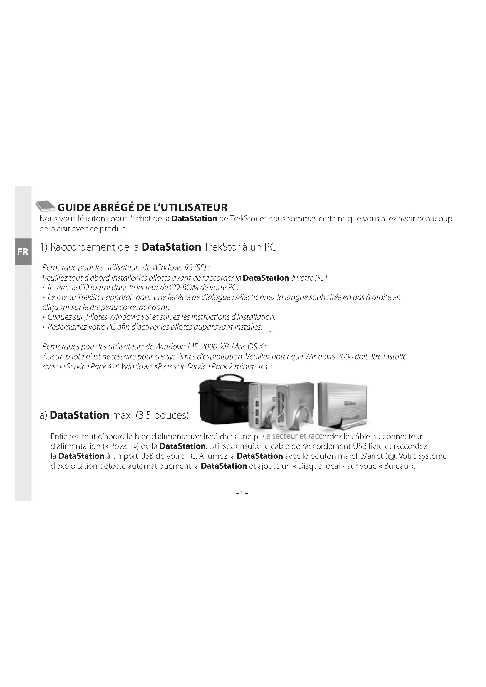 - Si vous exposez l’appareil à une décharge électrostatique, une interruption du transfert de données entre l’appareil et l’ordinateur n’est pas exclue. Dans ce cas, débranchez l’appareil du port USB et rebranchez-le. Le fabricant se réserve le droit de poursuivre continuellement le développement du produit. Ces modications peuvent être réalisées sans description directe dans ce guide abrégé de l’utilisateur. Les informations gurant dans ce guide abrégé de l’utilisateur peuvent de ce fait ne pas reéter l’état de l’exécution technique. Le fabricant garantit uniquement l’aptitude portant sur la nalité initiale de ce produit. Le fabricant n’endosse en outre aucune responsabilité pour des détériorations ou la perte de données et leurs dommages consécutifs. Copyright © 2006 TrekStor GmbH & Co. KG. Tous droits réservés. D’autres produits et noms d’entreprises ici mentionnés peuvent être des marques déposées ou des produits de marques de leurs propriétaires respectifs. – 10 – FRGUIDA RAPIDA Ci congratuliamo con Lei, gentile cliente, per l‘acquisto di TrekStor DataStation e siamo certi che sarà profondamente soddisfatto del presente prodotto.