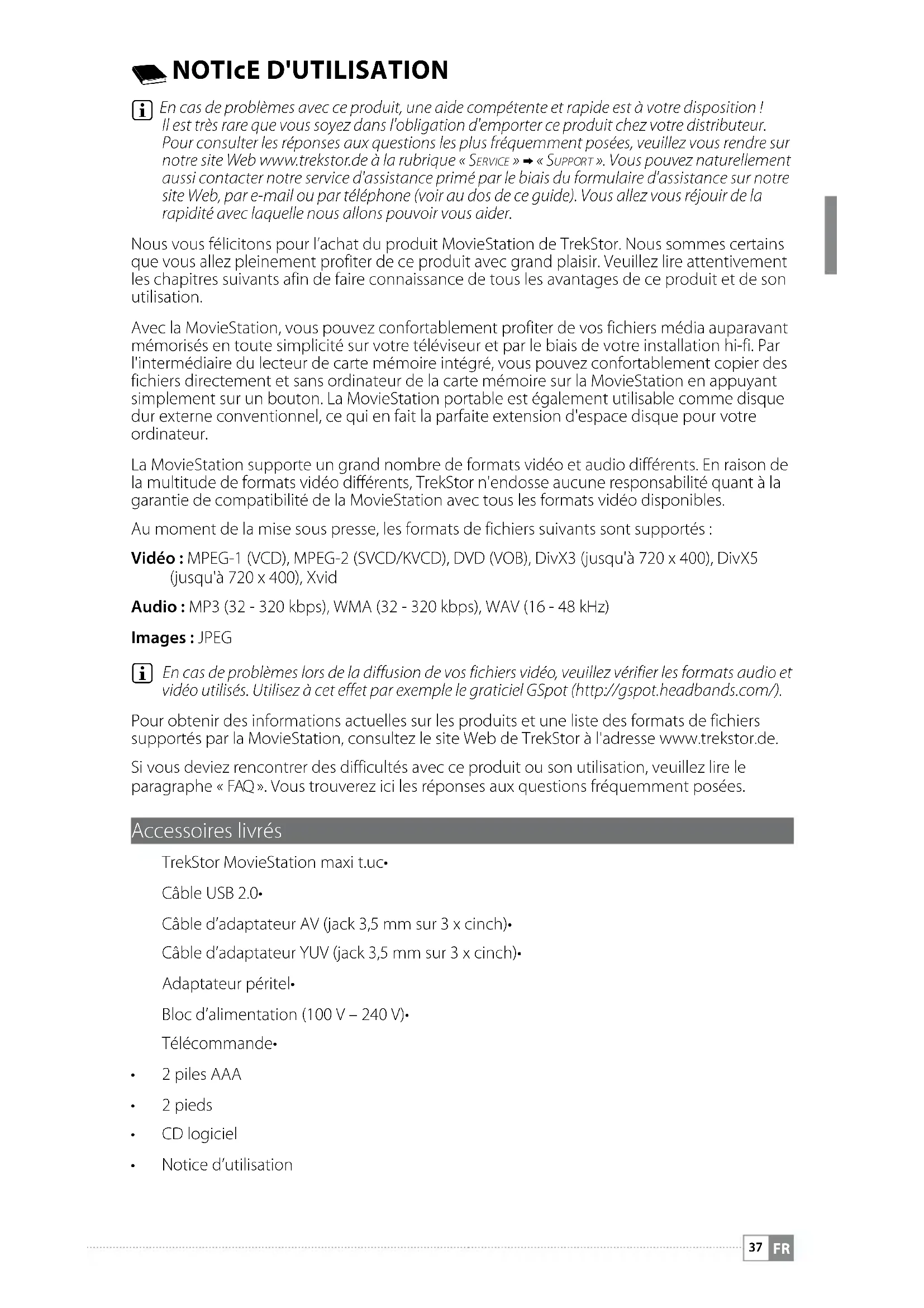 En cas de problèmes lors de la diffusion de vos fichiers vidéo, veuillez vérifier les formats audio et vidéo utilisés. Utilisez à cet effet par exemple le graticiel GSpot (http://gspot.headbands.com/). Pour obtenir des informations actuelles sur les produits et une liste des formats de fichiers supportés par la MovieStation, consultez le site Web de TrekStor à l'adresse www.trekstor.de. Si vous deviez rencontrer des difficultés avec ce produit ou son utilisation, veuillez lire le paragraphe « FAQ ». Vous trouverez ici les réponses aux questions fréquemment posées. Accessoires livrés TrekStor MovieStation maxi t.uc• Câble USB 2.0• Câble d’adaptateur AV (jack 3,5 mm sur 3 x cinch)• Câble d’adaptateur YUV (jack 3,5 mm sur 3 x cinch)• Adaptateur péritel• Bloc d’alimentation (100 V – 240 V)• Télécommande• 2 piles AAA• 2 pieds• CD logiciel• Notice d’utilisation•FR