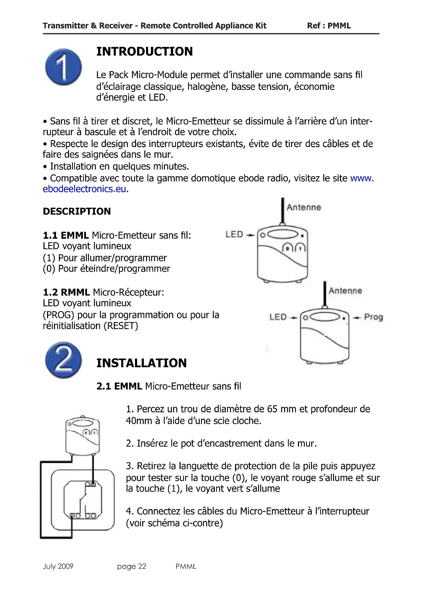 Vériez le bon fonctionnement Allumer/Eteindre à partir de l’interrupteur. Veillez à respecter un délai d’environ une seconde entre chaque basculement Allumer/Eteindre. Lors d’un changement de pile, le code enregistré reste sauvegardé dans le Micro-Emetteur. CONSEILS - base de connaissance disponible et mise à jour sur www.ebodeelectronics.euTransmitter & Receiver - Remote Controlled Appliance Kit Ref : PMML July 2009 page 26 PMML INTRODUCCIÓN El KIT MICRO MÓDULO permite instalar un controlador inalámbrico para apliques de luz incandescentes, halógenos, de baja tensión, de bajo consumo y LED.