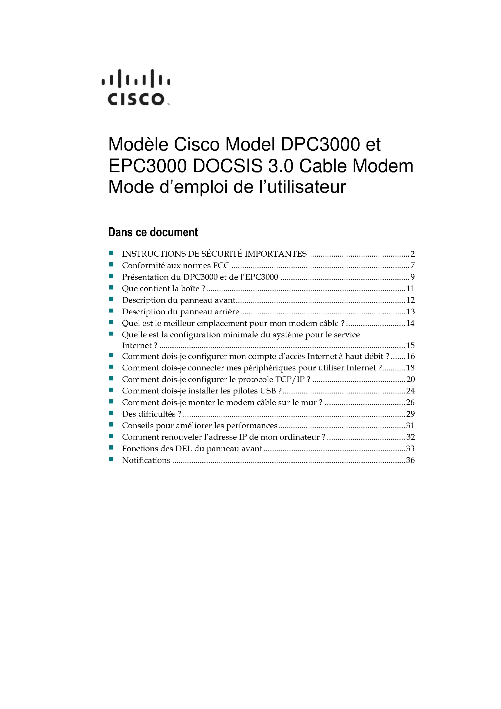 Modèle Cisco Model DPC3000 et EPC3000 DOCSIS 3.0 Cable Modem Mode d'emploi de l'utilisateur
