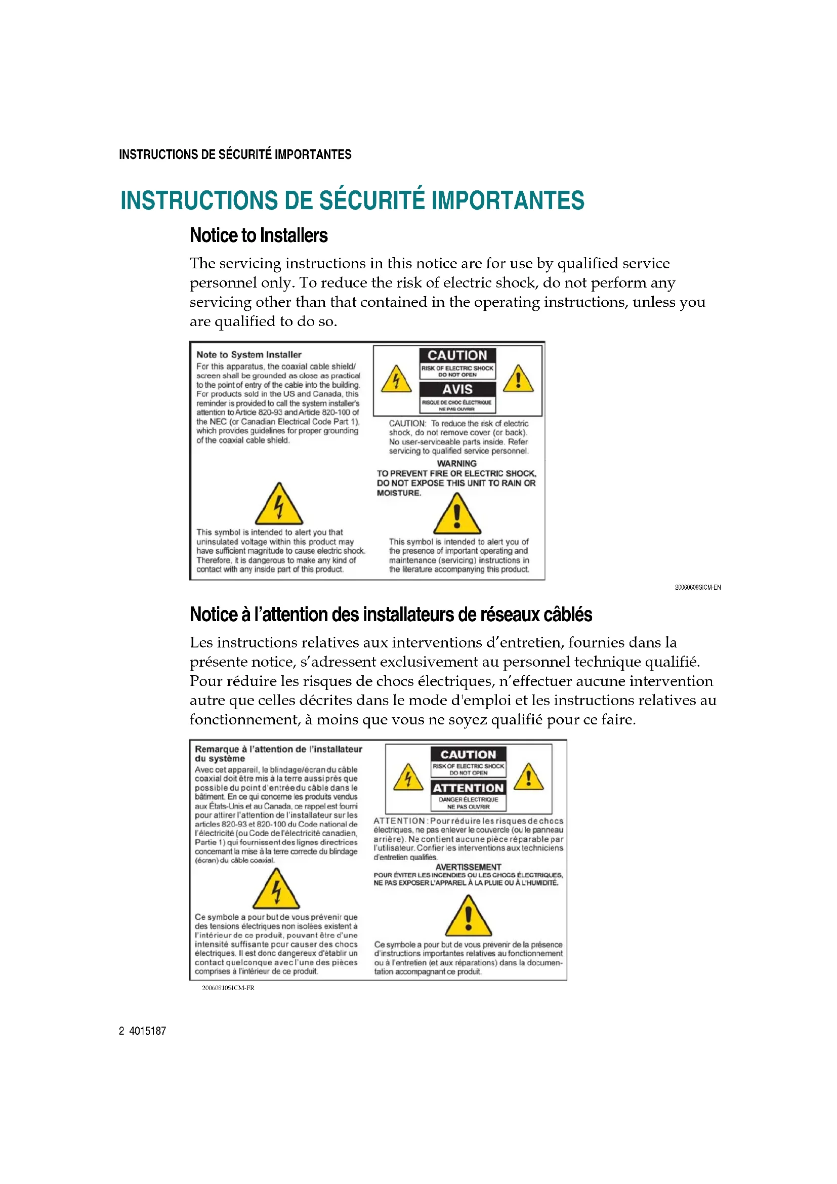 Notice to Installers The servicing instructions in this notice are for use by qualified service personnel only. To reduce the risk of electric shock, do not perform any servicing other than that contained in the operating instructions, unless you are qualified to do so. 20060608SICM-EN Notice à l’attention des installateurs de réseaux câblés Les instructions relatives aux interventions d’entretien, fournies dans la présente notice, s’adressent exclusivement au personnel technique qualifié. Pour réduire les risques de chocs électriques, n’effectuer aucune intervention autre que celles décrites dans le mode d'emploi et les instructions relatives au fonctionnement, à moins que vous ne soyez qualifié pour ce faire. 20060810SICM-FR4015187 3