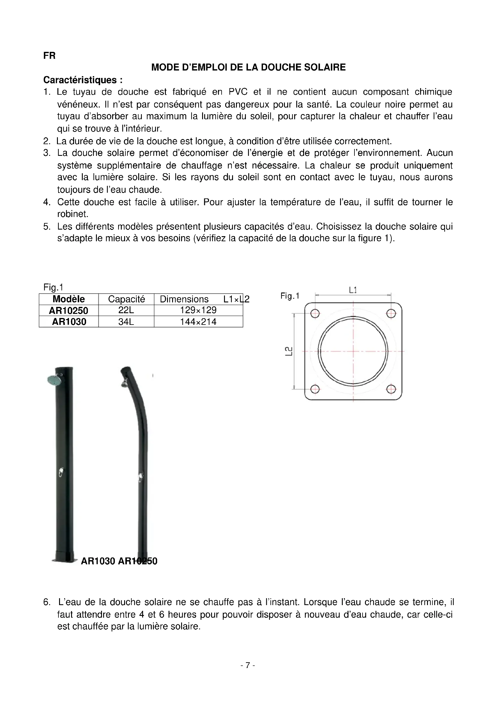 - Les différents modèles représentent plusieurs capacités d'eau. Choisissez la douche solaire qui s'adapte le mieux à vos besoins (vérifiez la capacité de la douche sur la figure 1).