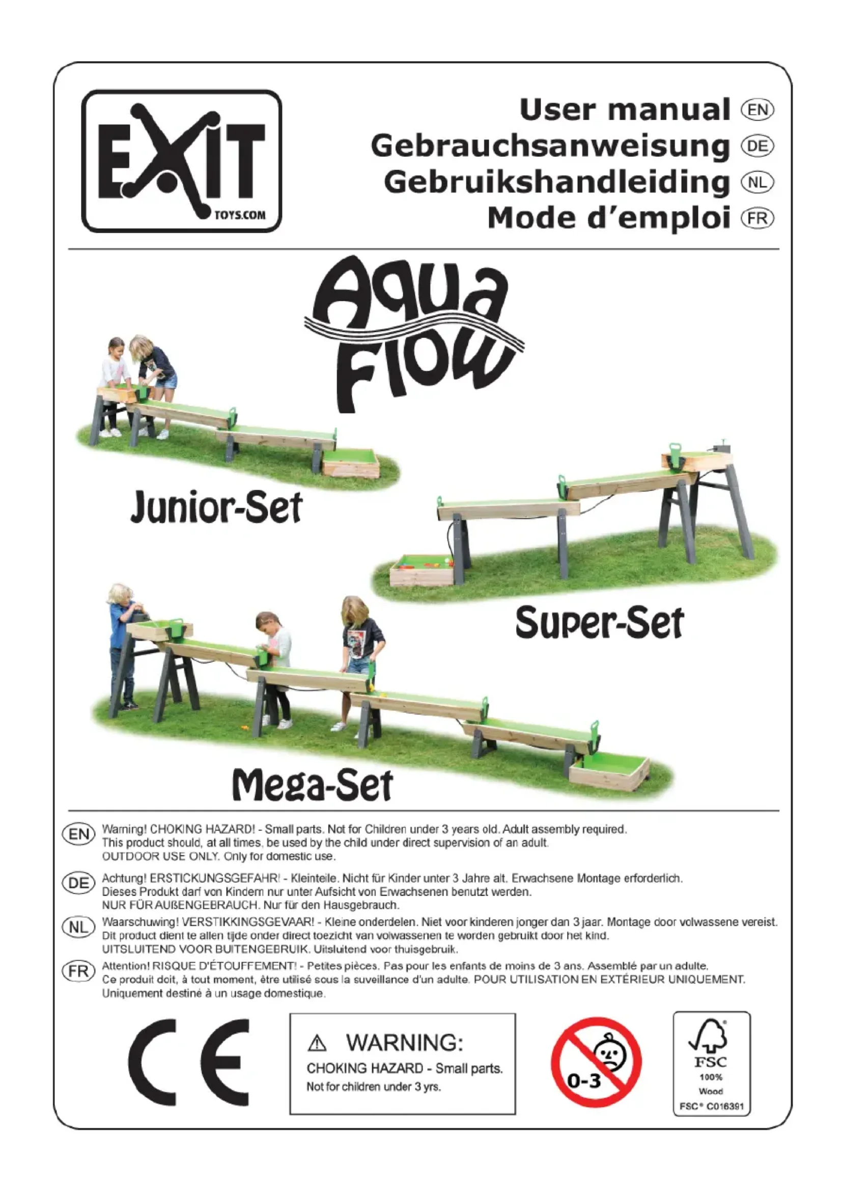 En cas d'utilisation correcte, Dutch Toys Group B. V. offre pour les pistes d'eau de peu en bois EXIT, une garantie de 1 ans sur les raccords et accessoires et une garantie de 2 ans sur le bois.