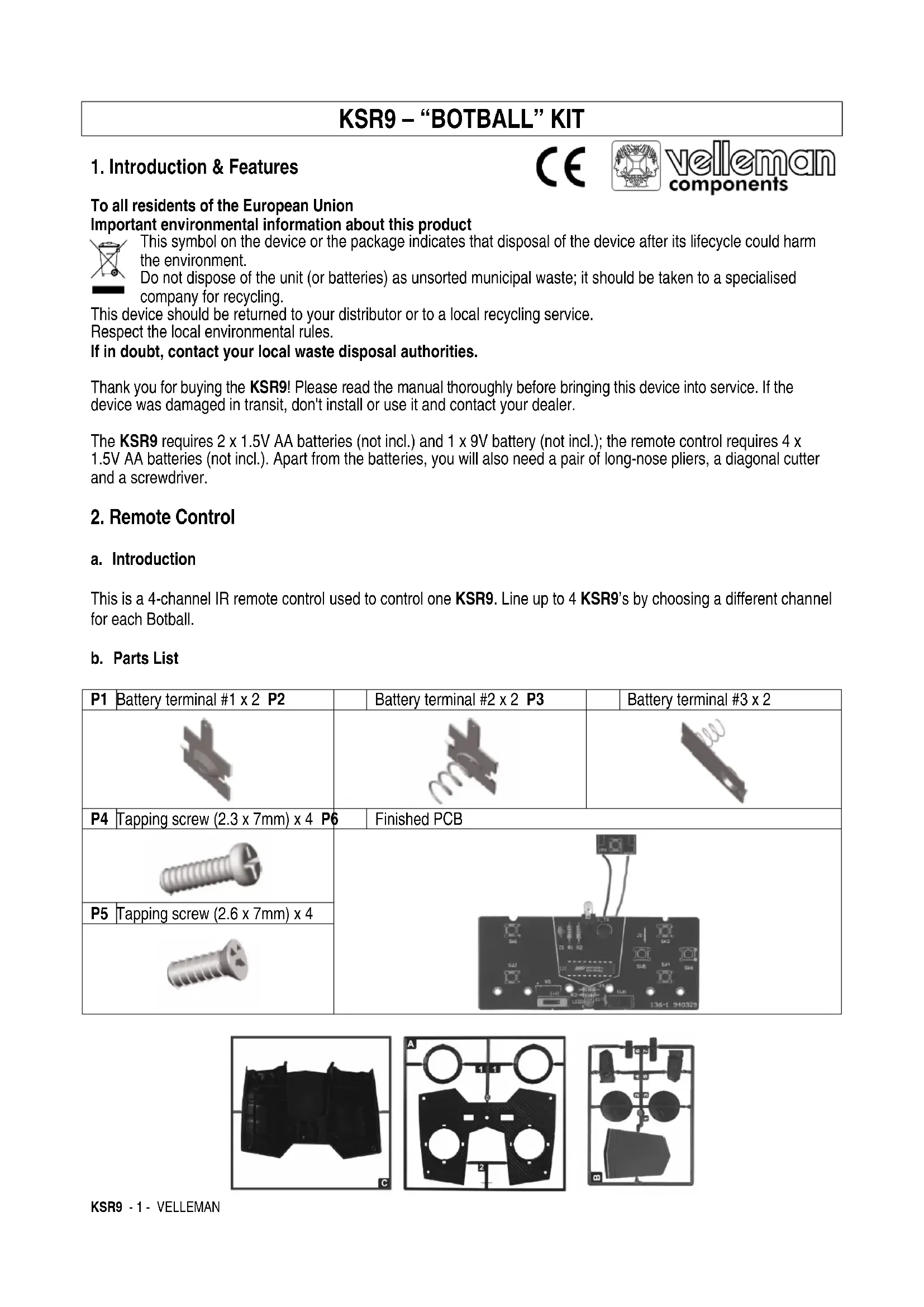 Manœuvrez votre Botball à l’aide de la télécommande. Choisissez un canal pour chaque Botball (max. 4 robots) si vous désirez vous opposer à d’autres joueurs.KSR9 - 12 - VELLEMAN b. Liste des pièces (voir ill. à la page 3) P1-1 : Moteur x 2 (câble vert et jaune) P16 : Rondelle x 2 P1-2 : Moteur x 1 (câble orange et bleu) P17 : Écrou à tête ronde x 2 P2 : Porte-moteur x 2 P18 : Vis de montage (3 x 12mm) x 1 P3 : Pignon 36T/14T (blanc) x 2 P19 : Vis autotaraudeuse (3 x 7mm) x 10 P4 : Pignon 36T/14T (rouge) x 2 P20 : Tube jaune x 2 P5 : Pignon 36T/0T (blanc) x 2 P21 : Vis de montage (3 x 6mm) x 1 P6 : Pignon 48T/18T (blanc) x 3 P22 : Vis autotaraudeuse (2.3 x 12mm) x 3 P7 : Pignon 10T (blanc) x 1 P23 : Vis autotaraudeuse (2.3 x 7mm) x 17 P8 : Pignon 8T (blanc) x 3 P24 : Vis de montage (2 x 5mm) x 2 P9 : Entretoise x 1 P25 : Éponge x 1 P10 : Entretoise hexagonale x 1 P26 : Ronfleur x 1 P11 : Roue x 2 P27 : Porte-piles x 1 P12 : Pneu x 2 P28 : Contact à pression x 1 P13 : Arbre rond (3 x 25mm) x 2 P29 : Boîtier x 1 P14 : Arbre cranté (2 x 13mm) x 1 P30 : Œillet x 2 P15 : Arbre rond (2 x 13mm) x 1 P31 : Carte imprimée c. Assemblage (voir ill. à la page 4, 5 et 6)