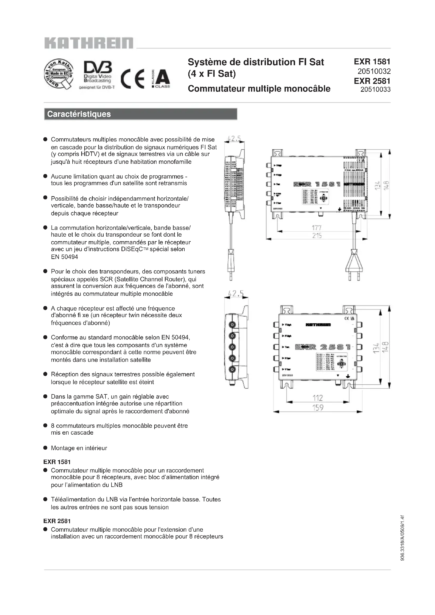 Commutateurs multiples monocâble avec possibilité de mise en cascade pour la distribution de signaux numériques FI Sat (y compris HDTV) et de signaux terrestres via un câble sur jusqu'à huit récepteurs d'une habitation monofamille Aucune limitation quant au choix de programmes - tous les programmes d'un satellite sont retransmis Possibilité de choisir indépendamment horizontale/verticale, bande basse/haute et le transpondeur depuis chaque récepteur La commutation horizontale/verticale, bande basse/haute et le choix du transpondeur se font dont le commutateur multiple, commandés par le récepteur avec un jeu d'instructions DiSEqC spécial selon EN 50494 Pour le choix des transpondeurs, des composants tuners spéciaux appelés SCR (Satellite Channel Router), qui assurent la conversion aux fréquences de l'abonné, sont intégrés au commutateur multiple monocâble A chaque récepteur est affecté une fréquence d'abonné fi xe (un récepteur twin nécessite deux fréquences d'abonné) Conforme au standard monocâble selon EN 50494, c'est à dire que tous les composants d'un système monocâble correspondant à cette norme peuvent être montés dans une installation satellite Réception des signaux terrestres possible également lorsque le récepteur satellite est éteint Dans la gamme SAT, un gain réglable avec préaccentuation intégrée autorise une répartition optimale du signal après le raccordement d'abonné 8 commutateurs multiples monocâble peuvent être mis en cascade Montage en intérieurEXR 1581 Commutateur multiple monocâble pour un raccordement monocâble pour 8 récepteurs, avec bloc d’alimentation intégré pour l’alimentation du LNB Téléalimentation du LNB via l’entrée horizontale basse. Toutes les autres entrées ne sont pas sous tensionEXR 2581 Commutateur multiple monocâble pour l'extension d'une installation avec un raccordement monocâble pour 8 récepteurs936.3318/A/0509/1.4f936.3318/A/0509/2.4f Type EXR 1581 EXR 2581 Référence 20510032 20510033 Raccordements d’abonnés 1 x 8 1 x 8 Entrées 1 x terrestre 4 x FI Sat 1 x terrestre 4 x FI Sat Plage de fréquence MHz 5-862 950-2150 5-862 950-2150 Affaiblissement de transmission dB - - 2,5 2,0 Atténuation de raccordement (terrestre) dB 1 - 7 - Gain au raccordement d'abonné (SAT)