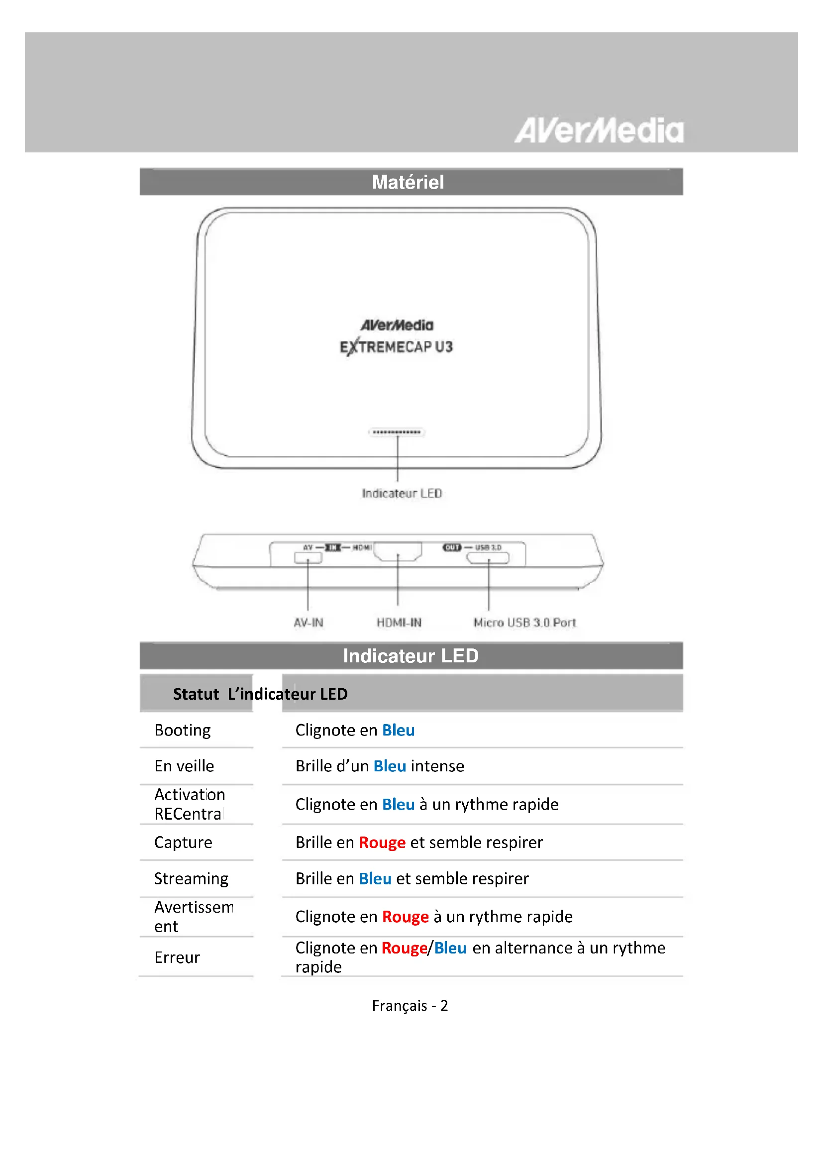 Clignote rapidement en rouge et bleuFrançais canadien- 3 Installation Étape 1 : Raccorder ExtremeCap U3 à un PC à l'aide du câble micro USB 3.0 fourni. Une fois raccordé, le voyant DEL clignote en BLEU pour indiquer l'initialisation; et reste allumé en BLEU lorsque l'appareil est prêt. Étape 2 : Téléchargez et installez le dernier pilote en date et RECentral de www.avermedia.com/avertv/support ou gamerzone.avermedia.com. Activer l'application Windows