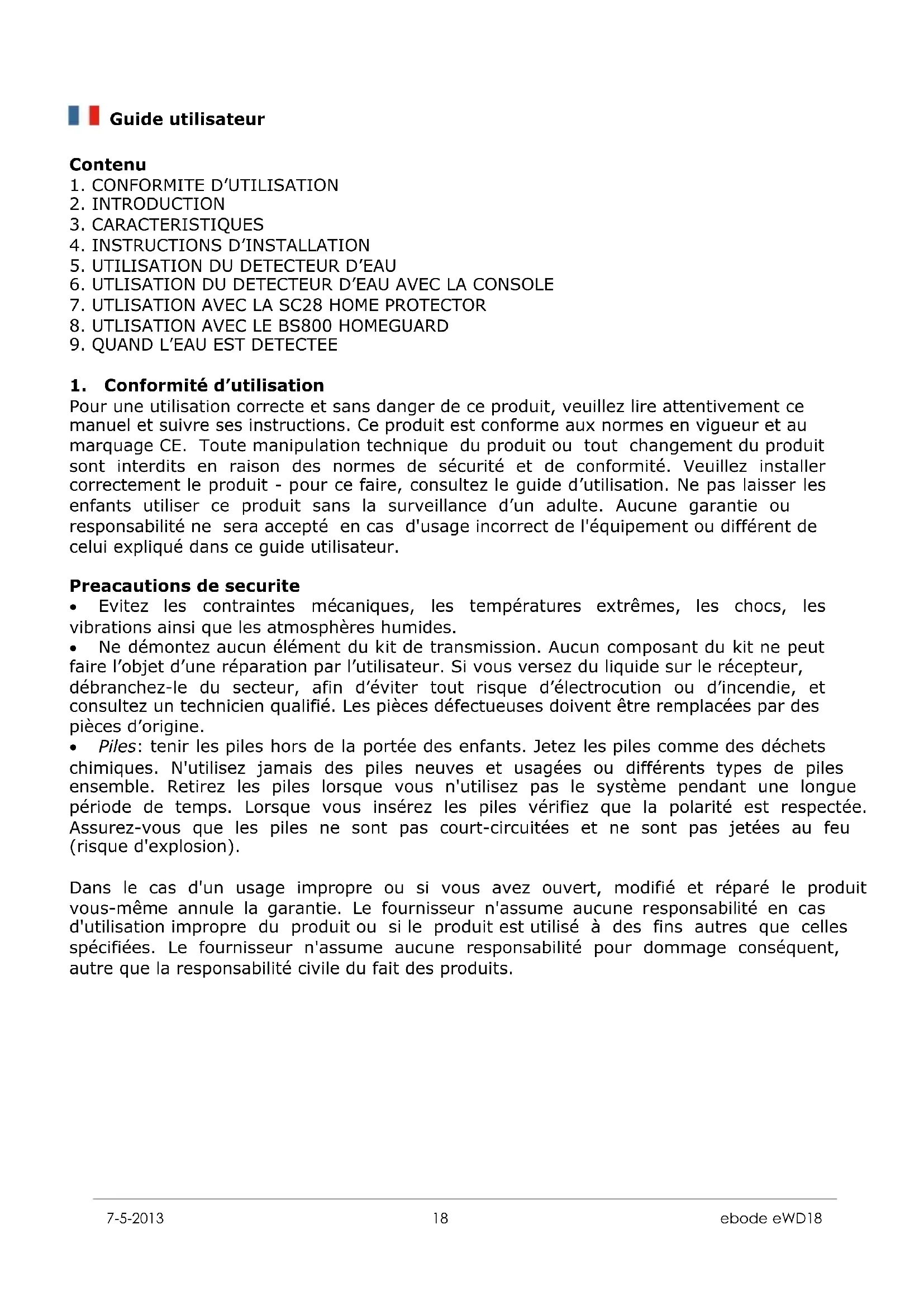 Nous vous remercions d’avoir acheté le eWD18 de Ebode. Soyez averti en cas d’inondation afin de pouvoir intervenir pour prévenir les dégâts des eaux. Le détecteur d’eau Ebode fonctionne sur batterie et est muni de deux capteurs qui doivent être placés là ou l’eau pénétrera. Lors d’une détection d’eau, le eWD18 déclenchera une alarme (85dB), comme un détecteur de fumée en tant que système autonome. Si vous enregistrez le eWD18 à un réseau X10 (BS800, HomeGuard et ProtectorPlus BS880/4 et BS880/7), il fera alors partie de votre système de sécurité et un message d’alarme sera envoyé. Pour plus d’informations à ce propos, merci de consulter les guides d’utilisation du HomeGuard et ProtectorPlus. Le eWD18 peut fonctionner avec les consoles de sécurité suivantes: SC28 Home Protector BS800 HomeGuard Le eWD18 peut également fonctionner en système autonome.