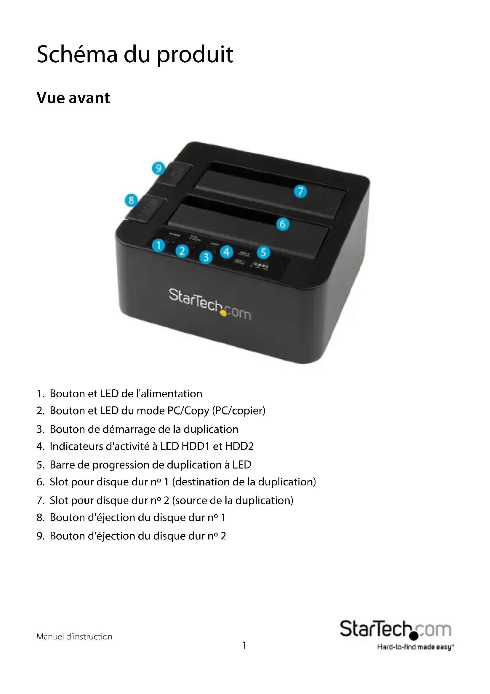 - Slot pour disque dur n° 1 (destination de la duplication)