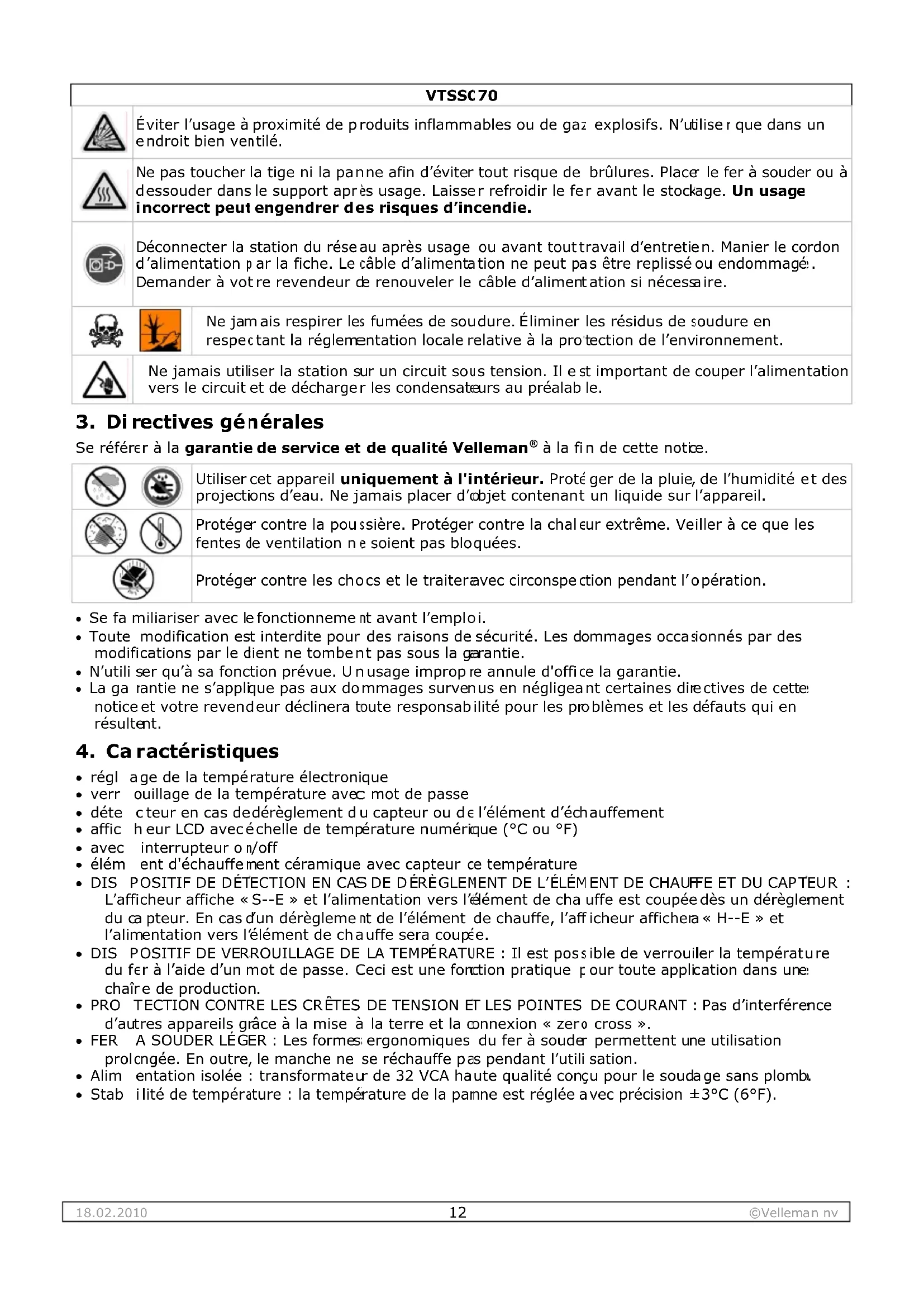 32V AC poids 1,58 kg dimensions 185 x 100 x 170 mm N’employer cet appareil qu’avec des accessoires d’origine. SA Velleman ne sera aucunement responsable de dommages ou lésions survenus à un usage (incorrect) de cet appareil. Voor meer informatie omtrent dit product en de meest recente versie van deze handleiding, zie www.velleman.eu. Toutes les informations présentées dans cette notice peuvent être modifiées sans notification préalable.