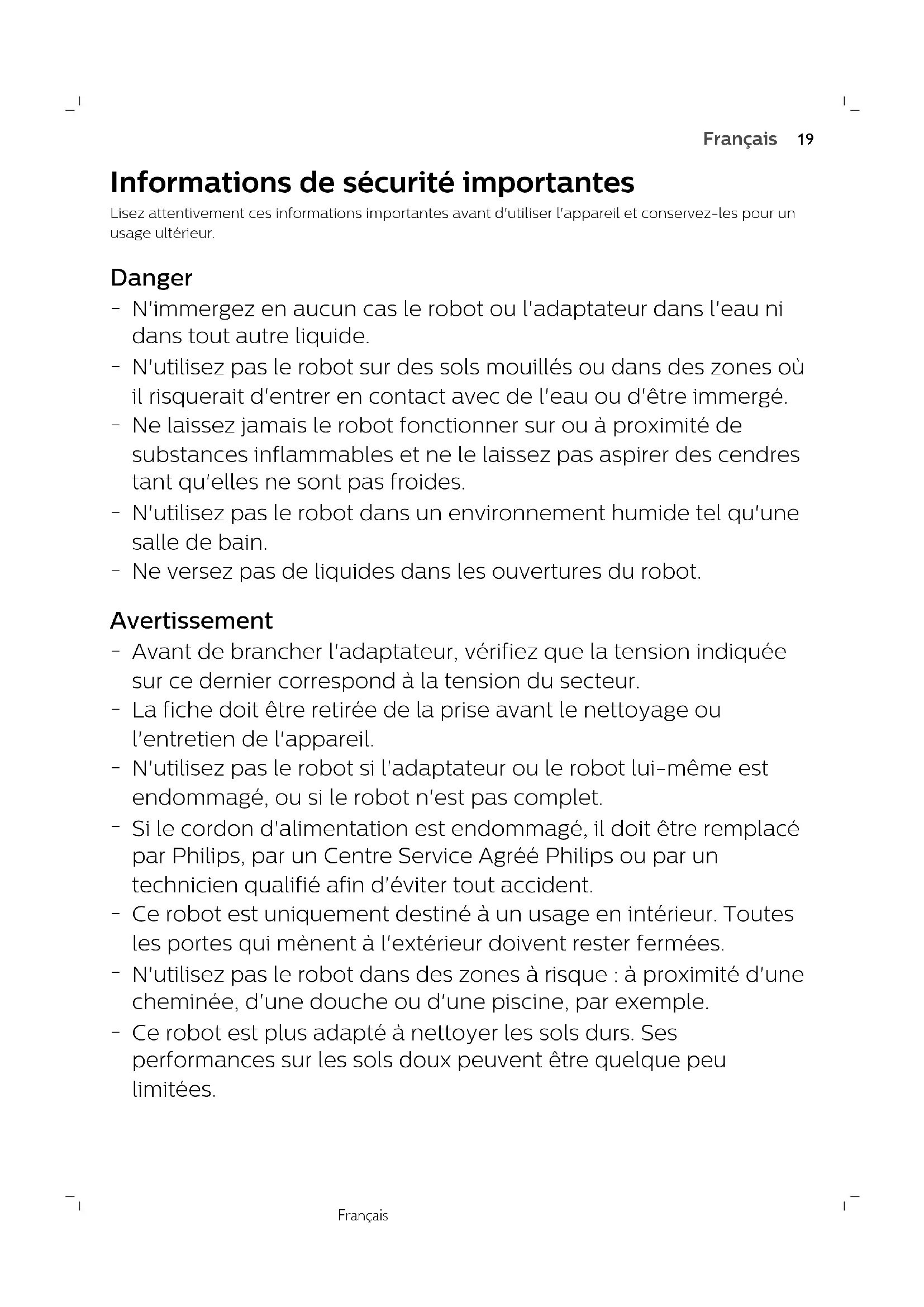 N'immergez en aucun cas le robot ou l'adaptateur dans l'eau ni dans tout autre liquide.