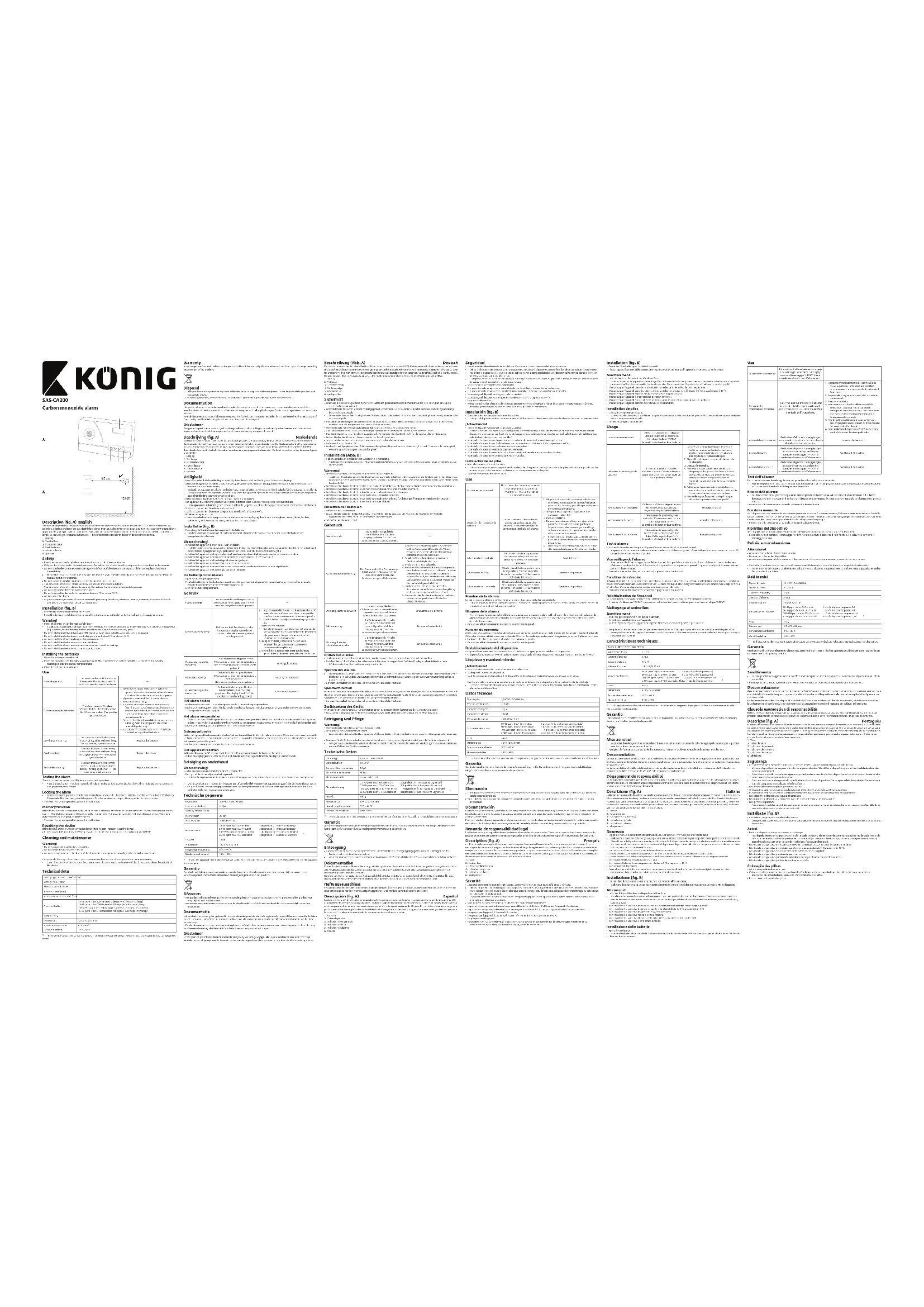 - Pour plus d’informations, contactez le distributeur ou l’autorité locale responsable de la gestion des déchets. Documentation Le produit a été fabriqué et fourni en conformité avec toutes les directives et règlements applicables et en vigueur dans tous les États membres de l’Union Européenne. Le produit est conforme aux spécications et à la réglementation en vigueur dans le pays de vente. La documentation ocielle est disponible sur demande. La documentation ocielle inclut notamment la Déclaration de conformité, la che technique de sécurité et le rapport de test de produit. Dégagement de responsabilité Le design et les caractéristiques techniques sont sujets à modication sans notication préalable. Tous les logos de marques et noms de produits sont des marques déposées ou immatriculées dont leurs détenteurs sont les propriétaires et sont donc reconnues comme telles dans ce document. Descrizione (g. A) Italiano L’allarme per monossido di carbonio è un dispositivo usato per rilevare la presenza di monossido di carbonio (CO). Il monossido di carbonio è un gas incolore, inodore e insapore leggermente meno denso dell’aria. Il monossido di carbonio è tossico per l’uomo in concentrazioni superiori a ca 35 ppm. Il monossido di carbonio deriva dalla combustione incompleta di combustibile (carbonella, carbone, olio combustibile per riscaldamento, benzina, kerosene, gas naturale, propano, butano, ecc.). L’allarme per monossido di carbonio non rileva fumo o calore.
