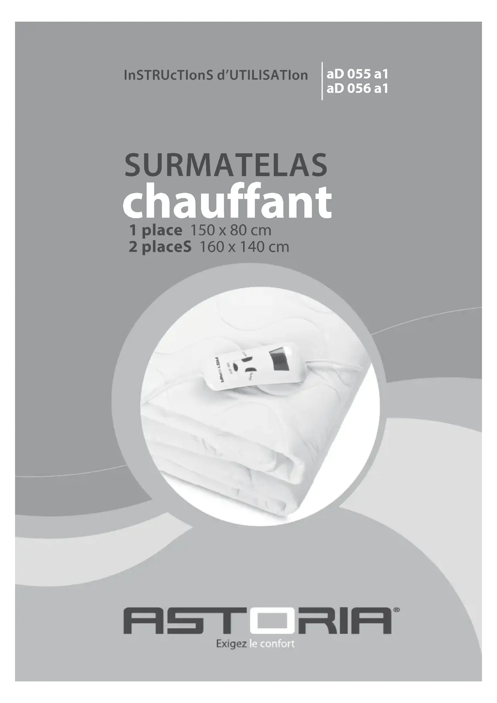 chauffant SURMATELAS 1 place 150 x 80 cm 2 placeS 160 x 140 cm aD 055 a1 aD 056 a1 InSTRUcTIonS d’UTILISATIon Document et visuels non contractuels. Caractéristiques susceptibles d’être modiées sans préavis. Mai 2014 - V1Avec le surmatelas chauant confort Astoria, reposez-vous sur les garanties d’une marque forte de plus de 10 ans d’expérience dans le domaine des tissus chauants. Nous vous demandons de lire très attentivement les instructions données dans cette notice car elles fournissent, entre autres, des informations importantes relatives à la sécurité d’utilisation et d’entretien. Gardez cette notice, vous pourriez avoir besoin de vous y référer dans le futur. Performance, ergonomie, sécurité… RecommanDationS De SécuRité