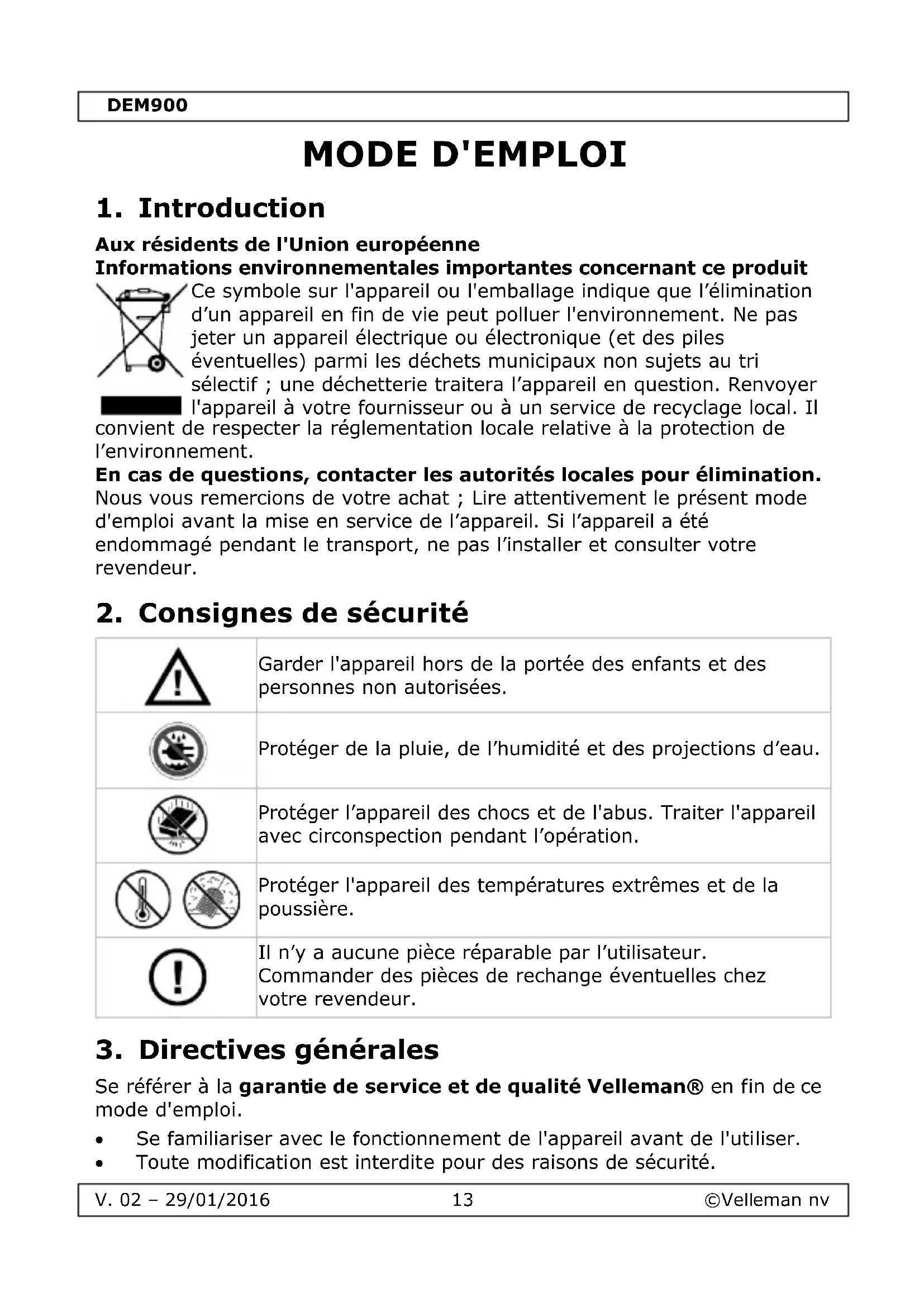 Retrouvez gratuitement la notice de l'appareil DEM900 VELLEMAN au format PDF.